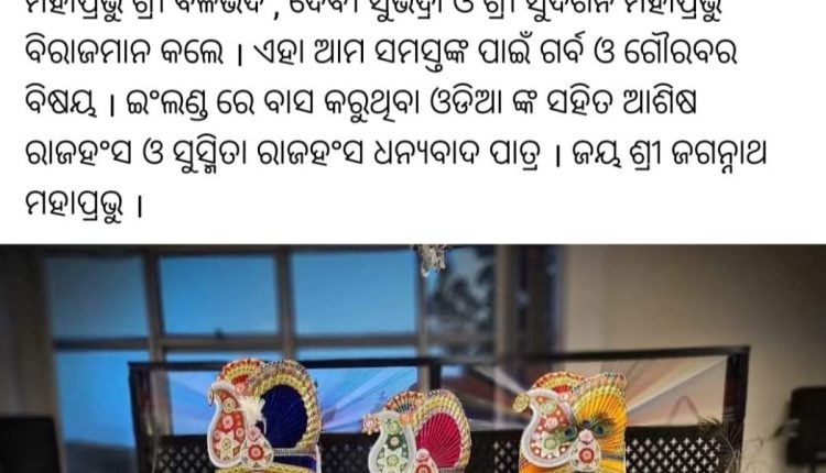 ସାତ ସମୁଦ୍ର ପାର ଇଂଲଣ୍ଡର ବାଥ୍ ସହରରେ ମହାପ୍ରଭୁ ଶ୍ରୀଜଗନ୍ନାଥ, ମହାପ୍ରଭୁ ଶ୍ରୀବଳଭଦ୍ର, ଦେବୀ ସୁଭଦ୍ରା ଓ ଶ୍ରୀସୁଦର୍ଶନ ମହାପ୍ରଭୁ ବିରାଜମାନ କରିଛନ୍ତି । ଏହା ଆମ ସମସ୍ତଙ୍କ ପାଇଁ ଗର୍କ ଓ ଗୌରବର ବିଷୟ । ଇଂଲଣ୍ଡରେ ବାସ କରୁଥିବା ଓଡିଆଙ୍କ ସହିତ ଆଶିଷ ରାଜହଂସ ଓ ସୁସ୍ମିତା ରାଜହଂସ ଧନ୍ୟବାଦର ପାତ୍ର । ଜୟ ଶ୍ରୀଜଗନ୍ନାଥ ମହାପ୍ରଭୁ ।