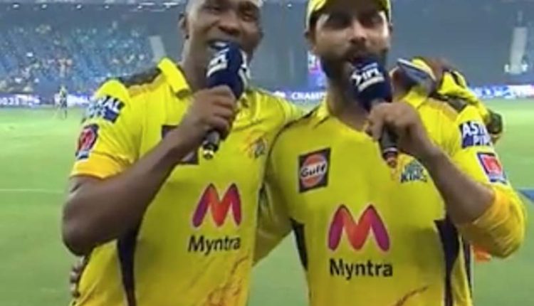 ଦୁବାଇ : ଶୁକ୍ରବାର ଦିନ ଚେନ୍ନାଇ ସୁପର କିଙ୍ଗ୍‌ସ କୋଲକତାକୁ ୨୭ରନରେ ହରାଇ ଆଇପିଏଲ ଇତିହାସରେ ଚତୁର୍ଥ ଥର ଚମ୍ପିଆନ ହୋଇଛି । ଏହି ବିଜୟ ପରେ ଦଳର ଖେଳାଳିମାନେ ଉତ୍ସବ ମନାଇଥିଲେ । ଏହି ଅବସରରେ ଦଳର ଷ୍ଟାର ଅଲରାଉଣ୍ଡର ରବିନ୍ଦ୍ର ଜାଡେଜା ଓ ଡ୍ୱେନ ବ୍ରାଭୋ ଚେନ୍ନାଇର ଥିମ୍‌ ସଂଗ ଗାନ କରି ଏବେ ଚର୍ଚ୍ଚାରେ ଅଛନ୍ତି । ଚେନ୍ନାଇ ଥିମ୍‌ ସଂଗ ବି ଆର୍‌ ଦୋ ଚେନ୍ନାଇ ବଏଜ ଗୀତ ଗାଇଥିଲେ ଏହି ଦୁଇ ଅଲରାଉଣ୍ଡର ।