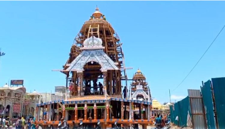 ପୁରୀ : ମହାପ୍ରଭୁଙ୍କ ରଥ ନିର୍ମାଣ ଶେଷ ପର୍ଯ୍ୟାୟରେ ପହଞ୍ଚିଛି । ବେଦୀ ସିଂହାସନ ଓ କନ୍ୟା ପଟା, ହଂସ ପଟା ଆଦି କାର୍ଯ୍ୟ ଚାଲୁ ରହଛି । ତିନିରଥରେ ଲାଗିଛି ଧ୍ୱଜବତା । ଦୁଆରିବେଢା ଉପର ଭାଗରେ ଚନ୍ଦ୍ରଶାଳି ଲଗାଯାଇଛି । ମଝି ଭୂଇଁରେ କଣ୍ଟା ବାଡିଆ ଯାଇଛି । ଦୁଆରବେଢା ସହ ନାଟଗୋଡ ଏବଂ ୧୪ ନାହାକାରେ ଦୁଆର ବାଣିଆ ଲଗାଯାଇଛି । ତିନିରଥ କୋଣରେ ମଣ୍ଡଣି ବତା ଏବଂ ବଡ଼ଫାଳିଆ ବତା ଲଗାଯାଇଛି । ରଥବେଦୀ ଚାରିପାର୍ଶ୍ୱରେ ପଟାବାଡିଆ ଶେଷ ହୋଇଛି । ରଥରେ ପ୍ରଭା ସଂଯୋଗ ପାଇଁ ସିଂହାସନ ବେଦୀ ପଛପାର୍ଶ୍ୱରେ ଦୁଇଟି ଲେଖାଏ ଧୂଳିଦଣ୍ଡା ଲଗାଯାଇଛି । ରୂପକାର ସେବକ ରଥ ପ୍ରଭାରେ ଖୋଦେଇ କରୁଛନ୍ତି । ଚିତ୍ରକାରଙ୍କ ଦ୍ୱାରା ଗୁଜ ସମେତ ପାର୍ଶ୍ୱ ଦେବଦେବୀ ଓ ହଂସପଟାରେ ରଙ୍ଗ କରାଯାଉଛି । ଦରଜି ସେବକ ରଥକନା ସିଲେଇ କରିବା ସହ କନକମୁଣ୍ଡି ଚାନ୍ଦୁଆ ପ୍ରସ୍ତୁତ କରୁଛନ୍ତି । ଅସ୍ଥାୟୀ କମାରଶାଳରେ ଓଝା ସେବକଙ୍କ ଦ୍ୱାରା ଧୂଳିଦଣ୍ଡା କଣ୍ଟା, ଧ୍ୱଜାବତା କଣ୍ଟା, ସିଂହାସନ କଣ୍ଟା, ଶୁଆକଣ୍ଟା ଏବଂ ବାଗିଆ କଣ୍ଟା ପ୍ରସ୍ତୁତ କରାଯାଉଛି ।