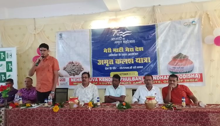 ଫୁଲବାଣୀ : ଟିକାବାଲି ଏ. ଏମ. ସି. ଏସ ମହାବିଦ୍ୟାଳୟରେ ଫୁଲବାଣୀ ନେହେରୁ ଯୁବ କେନ୍ଦ୍ର ତରଫରୁ ମୋ ମାଟି ମୋ ଦେଶ କାର୍ଯ୍ୟକ୍ରମ ଅଧ୍ୟକ୍ଷ ଦୀନବନ୍ଧୁ ମହାନ୍ତି ସଭାପତିତ୍ୱରେ ଅନୁଷ୍ଠିତ ହୋଇଯାଇଛି । ମୁଖ୍ୟ ଅତିଥି ଭାବରେ ଟିକାବାଲି ବ୍ଲକ ଅଧ୍ୟକ୍ଷ ଦିଲ୍ଲୀପ କହଁର ଯୋଗଦେଇ ଯୁବସମାଜ ଭିତରେ ଜାତୀୟ ଚେତନା ଓ ସ୍ୱଦେଶ ପ୍ରୀତି ରହିଲେ ଦେଶର ଅଖଣ୍ଡତା ବଜାୟ ରହିପାରିବ ବୋଲି ମତ ଦେଇଥିଲେ । ନେହରୁ ଯୁବକେନ୍ଦ୍ରର ସଂଯୋଜକ ନବନୀତ କୁମାର କାର୍ଯ୍ୟକ୍ରମର ଲକ୍ଷ୍ୟ ଆଭିମୁଖ୍ୟ ଉପରେ ଆଲୋକପାତ କରିଥିଲେ । ସମ୍ମାନିତ ଅତିଥିଭାବେ ଅଧ୍ୟାପକ ବିଷ୍ଣୁପ୍ରସାଦ ରଥ, ବିରୁପାକ୍ଷ ତ୍ରିପାଠୀ, ଅମୂଲ୍ୟ ସାବତ ମଂଚାସୀନ ଥିଲେ । ମୁଖ୍ୟବକ୍ତା ଭାବେ ଅଧ୍ୟାପକ ବନମାଳି ବେହେରା ଯୋଗଦେଇ ଦେଶସୁରକ୍ଷାରେ ଯବାନ ମାନଙ୍କ ବଳିଦାନ ଉପରେ ଆଲୋଚନା କରିଥିଲେ । ଅଧ୍ୟାପକ ସୁରଜ ସାସମଲ ଅତିଥି ପରିଚୟ ପ୍ରଦାନ କରିଥିବାବେଳେ ଅଧ୍ୟାପକ ରତନ ଦିଗାଲ, ସନ୍ତୋଷ ରଥ, ରବିନାରାୟଣ ପାଣିଗ୍ରାହୀ, ସୁଶାନ୍ତ ଭୋଳ, ଜ୍ଞାନରଞ୍ଜନ ଭୋଇ, ଶଙ୍କର ପାଢ଼ୀ, ଅଧ୍ୟାପିକା ଚମ୍ପା ସୋରେନ, ରଶ୍ମିତା ପ୍ରଧାନ, ମୀରାମ୍ବିକ ଯୋଗ ଦେଇଥିଲେ । ଛାତ୍ର ରୁଦ୍ର, ସୋମନାଥ, ଛାତ୍ରୀ ଜ୍ୟୋତି, ଅଞ୍ଜଳି କାର୍ଯ୍ୟକ୍ରମକୁ ପରିଚାଳନା କରିଥିଲେ । ସଂଗ୍ରହ କରାଯାଇଥିବା ମାଟିକୁ ସଂଯୋଜକଙ୍କୁ ଅର୍ପଣ କରାଯାଇଥିଲା ଓ ଦେଶର ଅଖଣ୍ଡତା ପାଇଁ ଶପଥ ପାଠ କରାଯାଇଥିଲା ।