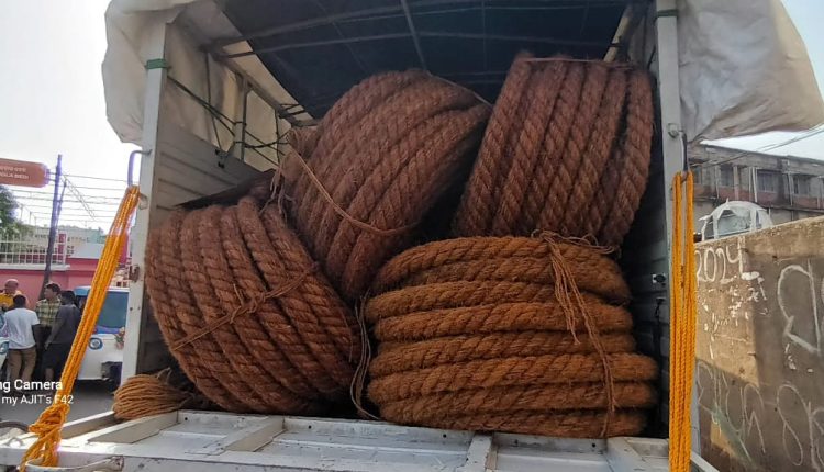 ପୁରୀ : ପୁରୀରେ ପହଞ୍ଚିଲା ରଥଯାତ୍ରା ପାଇଁ ରଥ ଦଉଡି। ୧୨ଟି ରଥ ଟଣା ଦଉଡି ଶ୍ରୀମନ୍ଦିର କାର୍ଯ୍ୟାଳୟରେ ପହଞ୍ଚିଛି। ପୁରୀ ବୀରପ୍ରତାପପୁରରେ ଥିବା ଓଡ଼ିଶା ସମବାୟ କତା ନିଗମ ପକ୍ଷରୁ ପ୍ରାୟ ଏକ ମାସ ଧରି ୧୪ ଜଣ କାରିଗର ଏହି ରଥ ଦଉଡି ପ୍ରସ୍ତୁତ କରିଛନ୍ତି। ଏହି ଦଉଡି ଶ୍ରୀମନ୍ଦିର ପ୍ରଶାସନ କାର୍ଯ୍ୟାଳୟରେ ପହଞ୍ଚିଛି। ତେବେ ରଥ ଦଉଡିର ଲମ୍ବ ୨୨୦ ଫୁଟ ହୋଇଥିବା ବେଳେ ଏହାର ଗୋଲେଇ ରହିଛି ୮ ଇଞ୍ଚ।