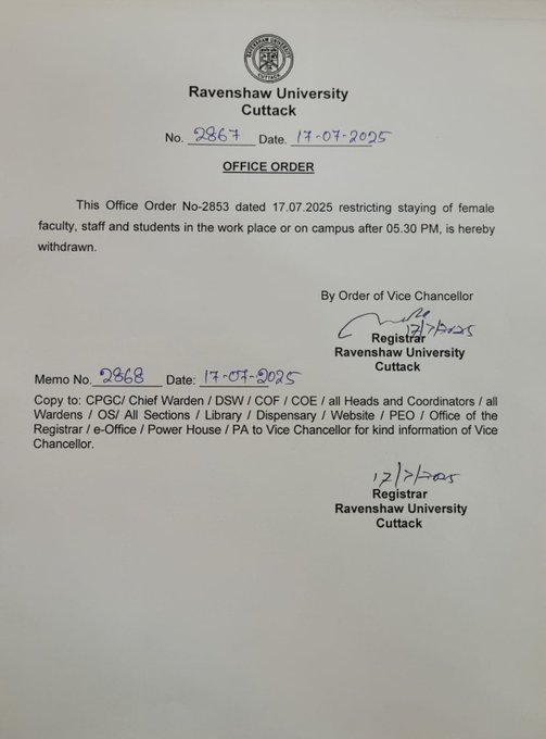 କଟକ : ରେଭେନ୍ସା ବିଶ୍ବବିଦ୍ୟାଳୟରେ ଛାତ୍ରୀ, ଅଧ୍ୟାପିକାଙ୍କ ପାଇଁ ପୂର୍ବ କଟକଣା ପ୍ରତ୍ୟାହାର କଲେ ବିଶ୍ବବିଦ୍ୟାଳୟ କର୍ତ୍ତୃପକ୍ଷ। ଘଣ୍ଟାଏରେ ବଦଳିଗଲା ନୋଟିସ। ସାଢ଼େ ୫ଟା ପରେ ବି କ୍ୟାମ୍ପସରେ ରହିପାରିବେ ଛାତ୍ରୀ ଓ ମହିଳା କର୍ମଚାରୀ। ବାଲେଶ୍ୱର ଫକୀରମୋହନ ମହାବିଦ୍ୟାଳୟ ଛାତ୍ରୀ ସୌମ୍ୟାଶ୍ରୀ ବିଶିଙ୍କ ଆତ୍ମାହୁତି ଘଟଣା ପରେ ରେଭେନ୍ସା ବିଶ୍ୱବିଦ୍ୟାଳୟ ପକ୍ଷରୁ ସାଢ଼େ ୫ଟା ପରେ ଛାତ୍ରୀ କ୍ୟାମ୍ପସ ବାହାରେ ନରହିବାକୁ ଥିଲା ପୂର୍ବ ନିର୍ଦ୍ଦେଶ।