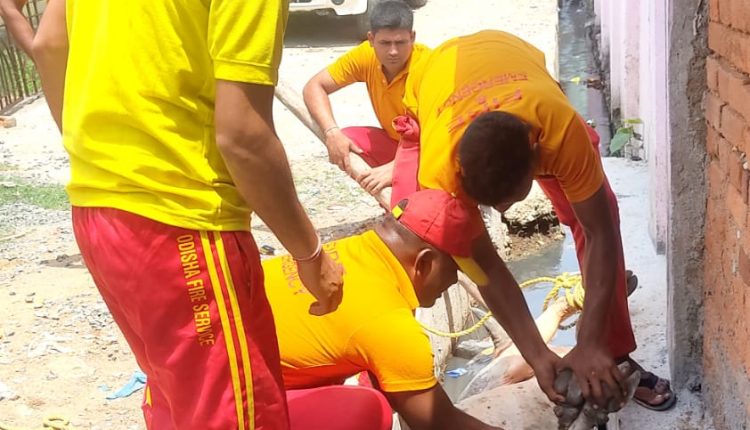 ଡ୍ରେନରେ ଫଶି ରହିଥିବା ଷଣ୍ଢକୁ ଉଦ୍ଧାର କଲେ ଅଗ୍ନିଶମ କର୍ମଚାରୀ