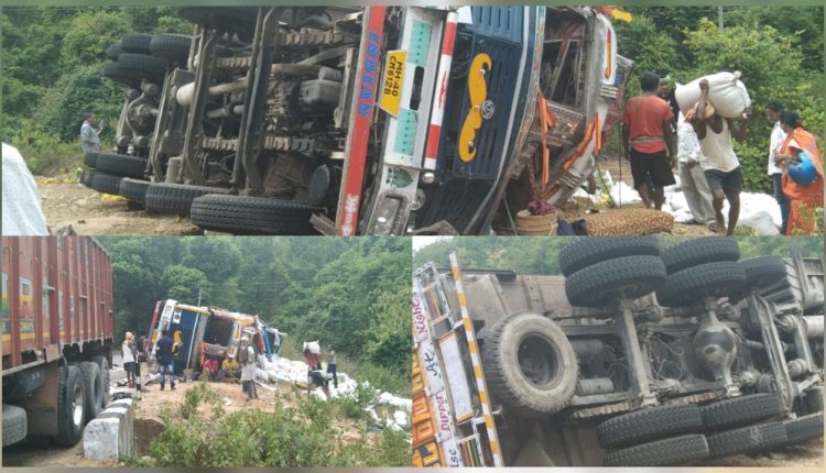 ଭାରସାମ୍ୟ ହରାଇ ଓଲଟିଲା ଶାଳ ମଞ୍ଜି ବୋଝେଇ ଟ୍ରକ୍‌ , ଅଳ୍ପକେ ବର୍ତ୍ତିଲେ ଡ୍ରାଇଭର ଓ ହେଲପର