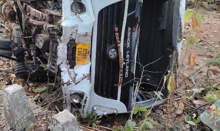 ଭାରସାମ୍ୟ ହରାଇ ରାସ୍ତା ତଳକୁ ଓଲଟିଲା ବାଲି ବୋଝେଇ ହାଇୱା