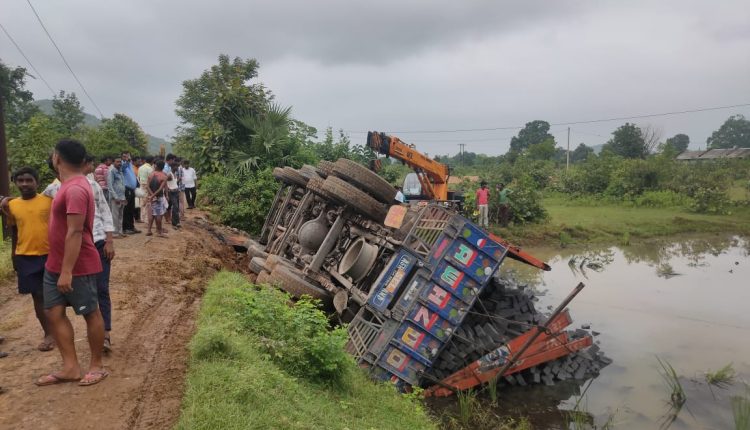 ହରଭଙ୍ଗା: ଆଜି ସକାଳ ୧୧ଟା ସମୟରେ ବୌଦ୍ଧଠାରେ ଥିବା ବି.ଡି.ପି.ଏଲ ଇଟା ଫ୍ୟାକ୍ଟେରୀରୁ ଏକ ଟ୍ରକ ନମ୍ବର ଓଡି ୧୫ ଜି ୫୬୫ରେ ସିମେଣ୍ଟ ଇଟା ନେଇ ହରଭଙ୍ଗାଠାରେ ଏଲ.ଏଣ୍ଡ.ଟି ମେଗା ପାନୀୟ ପ୍ରକଳ୍ପକୁ ଇଟା ଦେଇ ଆସୁଥିଲା । ଏହି ଟ୍ରକଟି ହରଭଙ୍ଗା ପୋଷ୍ଟ ଅଫିସ ନିକଟରେ ଥିବା ଏକ ମାଟି ରାସ୍ତା ଦେଇ ଯାଉଥିବା ସମୟରେ ମାଟି ରାସ୍ତାଟି ଦବିଯିବାରୁ ଟ୍ରକଟି ଭାରସାମ୍ୟ ହରାଇ ରାସ୍ତା କଡରେ ଓଲଟି ପଡିଥିଲା । ଫଳରେ ଟ୍ରକରେ ବସିଥିବା ୭ ଜଣ ଶ୍ରମିକ ଆହତ ହୋଇଥିବା ଜଣାପଡିଛି । ସ୍ଥାନୀୟ ଲୋକମାନେ ଶ୍ରମିକମାନଙ୍କୁ ଉଦ୍ଧାର କରି ହରଭଙ୍ଗା ଡାକ୍ତରଖାନାରେ ଚିକିତ୍ସା ପାଇଁ ଭର୍ତ୍ତି କରିଥିଲେ । ହରଭଙ୍ଗା ପୋଲିସ ଖବର ପାଇ ତଦନ୍ତ ଚଳାଇଥିବା ଜଣାପଡିଛି । ପ୍ରକାଶଥାଉକି ଏହି ରାସ୍ତା ଦେଇ ଭାରିଯାନ ଯାଇଥିବାରୁ ଏପରି ହେଇଥିବା ଜଣାପଡିଛି ।