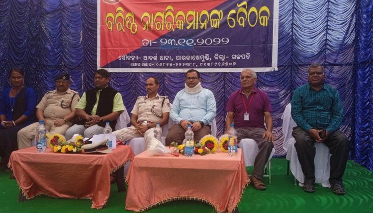 ପାରଳାଖେମୁଣ୍ଡି : ଗଜପତି ଜିଲ୍ଲା ସଦର ମହକୁମା ପାରଳାଖେମୁଣ୍ଡି ସ୍ଥିତ ଆଦର୍ଶ ଥାନା ପରିସରରେ ବରିଷ୍ଠ ନାଗରିକ ମାନଙ୍କର ଏକ ବୈଠକ ଅନୁଷ୍ଠିତ ହୋଇଯାଇଛି । ଏହି ବୈଠକକୁ ଗଜପତି ଆରକ୍ଷୀ ଅଧିକ୍ଷକ ଜୟରାମ ଶତପଥୀ ପ୍ରଦୀପ ପ୍ରଜ୍ୱଳନ କରି ଶୁଭାରମ୍ଭ କରିଥିଲେ । ଏହି ବୈଠକରେ ଗଜପତି ଜିଲ୍ଲାପାଳ ଲିଙ୍ଗରାଜ ପଣ୍ଡା ମୁଖ୍ୟ ଅତିଥି ଭାବେ ଯୋଗ ଦେଇଥିବା ବେଳେ ଅତିରିକ୍ତ ଜିଲ୍ଲାପାଳ ସଂଗ୍ରାମ ଶେଖର ପଣ୍ଡା ସମ୍ମାନିତ ଅତିଥି ଭାବେ ଯୋଗ ଦେଇଥିଲେ । ଅତିରିକ୍ତ ଆରକ୍ଷୀ ଅଧିକ୍ଷକ ବାମ ଦେବ ସିଂ ବରିଷ୍ଠ ନାଗରିକ ହରି ମୋହନ ପଟ୍ଟନାୟକ, ଲକ୍ଷ୍ମୀ ନୃସିଂହ ରଥ ପ୍ରମୁଖ ମଞ୍ଚାସିନ ଥିଲେ । ଆଦର୍ଶ ଥାନା ଅଧିକାରୀ ବିବେକାନନ୍ଦ ସ୍ୱାଇଁ ଅତିଥି ପରିଚୟ ଓ ସ୍ୱାଗତ ଭାଷଣ ପ୍ରଦାନ କରିଥିଲେ । ୩୮ ଜଣ ବରିଷ୍ଠ ନାଗରିକ ଓ ୧୩ ଜଣ କିନ୍ନର ମାନଙ୍କୁ ଅତିଥିମାନେ ପରିଚୟ ପତ୍ର ପ୍ରଦାନ କରିଥିଲେ । ପରେ ଏକ ସ୍ୱାସ୍ଥ୍ୟ ଶିବିର ବରିଷ୍ଠ ନାଗରିକ ମାନଙ୍କ ସକାଶେ ଅନୁଷ୍ଠିତ ହୋଇଥିଲା । ବରିଷ୍ଠ ନାଗରିକ ମାନେ ନିଜର ସ୍ୱାସ୍ଥ୍ୟ ପରୀକ୍ଷା କରାଇ ଥିଲେ, ମାଗଣାରେ ଔଷଧ ବଣ୍ଟନ କରାଯାଇ ଥିଲା । ଏହି କାର୍ଯ୍ୟକ୍ରମରେ ସତ୍ୟବାଦୀ ପାତ୍ର, ଲବ ଜେନା, ରାମଚନ୍ଦ୍ର ପାଢ଼ୀଙ୍କ ସହ ବହୁ ବରିଷ୍ଠ ନାଗରିକ ଉପସ୍ଥିତ ଥିଲେ ।ଶେଷରେ ଆଦର୍ଶ ଥାନା ଅଧିକାରୀ ବିବେକାନନ୍ଦ ସ୍ୱାଇଁ ଧନ୍ୟବାଦ ଅର୍ପଣ କରିଥିଲେ ।