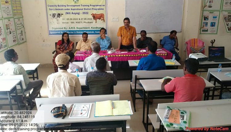 ଫୁଲବାଣୀ: ଆକାନଖା ଜିଲ୍ଲା ଅନ୍ତର୍ଗତ ଯୋଜନା ମାଧ୍ୟମରେ ଦୁଇଦିନିଆ ଜିଲ୍ଲାସ୍ତରୀୟ ଗୋପାଳ ଦକ୍ଷତା ତାଲିମ୍‌ ଶିବିର ଏସବିଆଇ ଆରସେଟି ଫୁଲବାଣୀ ଠାରେ ଅନୁଷ୍ଠିତ ହୋଇଯାଇଅଛି । ଆର୍‌ସେଟି ନିର୍ଦ୍ଦେଶକ ଚନ୍ଦ୍ର ଶେଖର ପ୍ରଧାନ ମୁଖ୍ୟ ଅତିଥି ଭାବେ ଯୋଗ ଦେଇଥିଲେ । ଜିଲ୍ଲା ମୁଖ୍ୟ ପ୍ରାଣୀ ଚିକିତ୍ସାଧିକାରୀ ଡଃ ଅଶୋକ କୁମାର ତ୍ରିପାଠୀଙ୍କ ସଭାପତିତ୍ୱରେ କାର୍ଯ୍ୟକ୍ରମ ସମାପନ ହୋଇଥିଲା । ଉପନିର୍ଦ୍ଦେଶକ ଡଃ ମନୋଜ କୁମାର ସାହୁ, ଅତିରିକ୍ତ ଜିଲ୍ଲା ଚିକିତ୍ସାଧିକାରୀ ରୋଗ ନିୟନ୍ତ୍ରଣ ଡଃ ସନ୍ତୋଷ କୁମାର ପଟ୍ଟନାୟକ, ଅତିରିକ୍ତ ଜିଲ୍ଲା ଚିକିତ୍ସାଧିକାରୀ ପ୍ରାଣୀ ମଙ୍ଗଳ ଡଃ ଦିଗବିଜୟ ଗିରି, ଅତିରିକ୍ତ ଜିଲ୍ଲା ଚିକିତ୍ସାଧିକାରୀ ଉତ୍ପାଦନ ଡଃ ରଞ୍ଜନ କୁମାର ସାହୁ ଆଦି ମାନବ ସମ୍ବଳ ଭାବେ ଚାଷୀ ଭାଇମାନଙ୍କୁ ପଥ ପ୍ରଦର୍ଶନ କରିଥିଲେ । ଡଃ ଅଳକା ପଟ୍ଟନାୟକ ଜିଲ୍ଲା ପ୍ରଶିକ୍ଷଣ ସଂଯୋଜିକା କାର୍ଯ୍ୟକ୍ରମକୁ ପରିଚାଳନା କରିଥିଲେ । ଚାଷୀମାନଙ୍କର ଏକସପୋଜର ଭିଜିଟ ୭.୯.୨୯୨୨ରେ ଚିପିଲିମା ଠାରେ ଅନୁଷ୍ଠିତ ହେବାର ବ୍ୟବସ୍ଥା ରହିଛି । ବାଲିଗୁଡ଼ା ଗୋପାଳକ ଚାଷୀଙ୍କୁ ଏହି ପ୍ରଶିକ୍ଷଣ ଦିଆଯାଇଛି ।