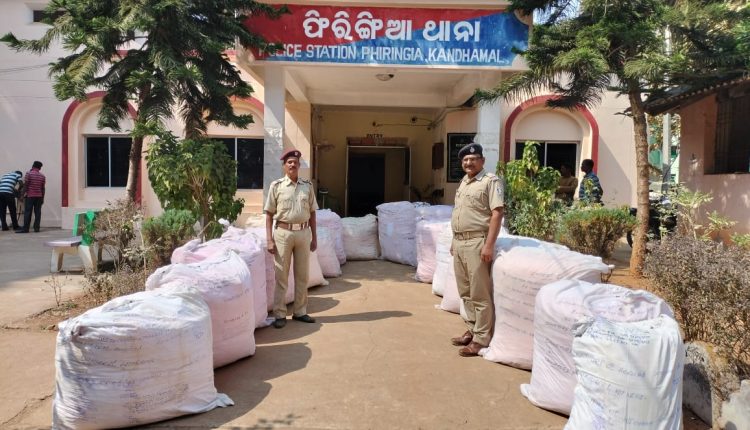 ଫୁଲବାଣୀ : କନ୍ଧମାଳ ଜିଲ୍ଲା ଫିରିଙ୍ଗିଆ ଥାନା ଅନ୍ତର୍ଗତ ଉପର ପାଙ୍ଗା ପଂଚାୟତର ଶିକାରୀ ଗ୍ରାମ ନିକଟ ଜଙ୍ଗଲରେ ଏକ କୁଡ଼ିଆ ଘର ଉପରେ ଚଢ଼ାଉ କରି ୮ କୁଇଣ୍ଟାଲ ୨୫ କେଜି ଗଂଜେଇ ଜବତ କରିଛି ଫିରିଙ୍ଗିଆ ପୋଲିସ । ଯାହା ସୂଚନା ରହିଛି ଏସପି ଶୁଭେନ୍ଦୁ କୁମାର ପାତ୍ରଙ୍କ ନିର୍ଦ୍ଦେଶକ୍ରମେ ଫିରିଙ୍ଗିଆ ଥାନା ଅଧିକାରୀ ତପନ କୁମାର ନାହାକଙ୍କ ନେତୃତ୍ୱରେ ଏକ ପୋଲିସ ଟିମ ଏହି ଚଢାଉରେ ସାମିଲ ହୋଇଥିଲା । ଏହି ଗଂଜେଇ ଚୋରା ଚାଲାଣ ପାଇଁ ପ୍ରସ୍ତୁତ ଚାଲିଥିବା ବେଳେ କୌଣସି ସୁତ୍ରରୁ ଖବର ପାଇ ପୋଲିସ ଟିମ ଚଢ଼ାଉ କରି ଥିଲେ । ତେବେ ପୋଲିସ ଟିମକୁ ଦେଖ ଅଭିଯୁକ୍ତ ମାନେ ଘଞ୍ଚ ଜଙ୍ଗଲ ଭିତରକୁ ଚାଲିଯାଇଥିଲେ ।