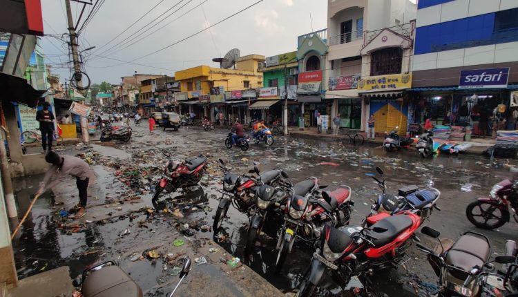 ପବନ ସହ ପ୍ରବଳ ବର୍ଷା, ମୁଖ୍ୟ ବଜାରରେ ଆଣ୍ଠୁଏ ଆବର୍ଜନା ପାଣି