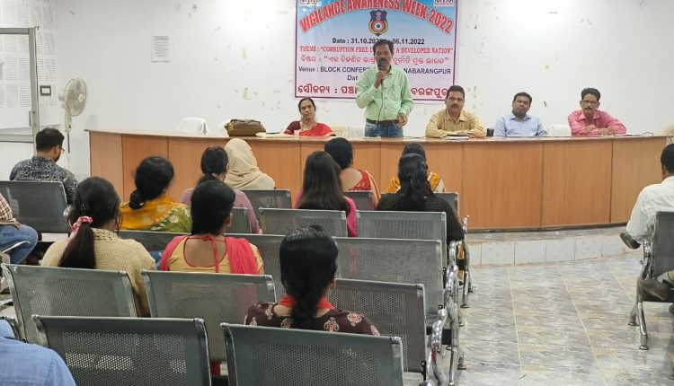 ନବରଙ୍ଗପୁର: ଦୁର୍ନୀତି ନିବାରଣ ସପ୍ତାହ ୨୦୨୨ପାଳନ ଅବସରରେ ନବରଙ୍ଗପୁର ବ୍ଲକ୍ ସ୍ତରୀୟ ଦୁର୍ନୀତି ନିବାରଣ ସଚେନତା ସଭା ଅନୁଷ୍ଠିତ ହୋଇଯାଇଛି । ମଙ୍ଗଳବାର ଦିନ ଅପରାହ୍ନରେ ବ୍ଲକ ସମ୍ମିଳନୀ କକ୍ଷ ଠାରେ ଏହି କାର୍ଯ୍ୟକ୍ରମ ଅନୁଷ୍ଠିତ ହୋଇଥିଲା । ଗୋଷ୍ଠି ଉନ୍ନୟନ ଅଧିକାରୀ ଶିବ ପ୍ରସାଦ ପଟ୍ଟନାୟକଙ୍କ ଅଧ୍ୟକ୍ଷତାରେ ଅନୁଷ୍ଠିତ ଏହି କାର୍ଯ୍ୟକ୍ରମରେ ଦୁର୍ନୀତି ମୁକ୍ତ ଭାରତ ଗଠନରେ ସରକାରୀ କର୍ମଚାରୀଙ୍କ ସମେତ ପ୍ରତ୍ୟେକ ନାଗରିକମାନଙ୍କ ପ୍ରମୁଖ ଭୂମିକା ରହିଥିବା ସମ୍ପର୍କରେ ବିଡ଼ିଓ ମତ ପ୍ରକାଶ କରିଥଲେ । ଆଗାମୀ ଦିନରେ ବିଭିନ୍ନ ସଚେତନତା କାର୍ଯ୍ୟକ୍ରମ ମାଧ୍ୟମରେ ଦୁର୍ନୀତିକୁ ରୋକିବା ପାଇଁ ପ୍ରଚେଷ୍ଟା କରାଯିବା ପାଇଁ ବୈଠକରେ ଆଲୋଚନା ହୋଇଥିଲା । ଏହି କାର୍ଯ୍ୟକ୍ରମରେ ଜିଲ୍ଲା ସୂଚନା ଓ ଲୋକସମ୍ପର୍କ ଅଧିକାରୀ ହଳଧର ନିଆଲ, ସିଡିପିଓ, ଏବିଓ, ସମ୍ପ୍ରସାରଣ ଅଧିକାରୀମାନଙ୍କ ସମେତ ବ୍ଲକ୍ ସ୍ତରୀୟ ଅଧିକାରୀ ଓ ବ୍ଲକ୍ କର୍ମଚାରୀ ମାନେ ଉପସ୍ଥିତ ରହିଥିଲେ । ସୂଚନା ଯୋଗ୍ୟ ଯେ, ଗତକାଲି ଭିଡିଓ କନଫରେନ୍ସ ମାଧ୍ୟମରେ ମୁଖ୍ୟମନ୍ତ୍ରୀଙ୍କ ଦ୍ୱାରା ଦୁର୍ନୀତି ନିବାରଣ ସମ୍ପର୍କିତ ସାଧୁତାର ଶପଥ ପାଠ ଉତ୍ସବ ଅନୁଷ୍ଠିତ ହୋଇଥିଲା ।