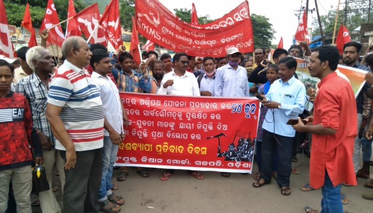 ପାରଳାଖେମୁଣ୍ଡି : କେନ୍ଦ୍ର ସରକାରଙ୍କ ଅଗ୍ନିପଥ ଯୋଜନାର ପ୍ରତ୍ୟାହାର ଦାବିରେ ଆଜି କୃଷକ ସଙ୍ଗଠନମାନଙ୍କ ମିଳିତ ମଞ୍ଚ, ସଂଯୁକ୍ତ କିଷାନ୍ ମୋର୍ଚ୍ଚା ପକ୍ଷରୁ ଆହୂତ ସର୍ବ ଭାରତୀୟ ପ୍ରତିବାଦ ଦିବସ ଆଜି ପାରଳାଖେମୁଣ୍ଡି ଠାରେ ପାଳିତ ହୋଇଯାଇଛି । ଆଜି ପୂର୍ବାହ୍ନରେ ସ୍ଥାନୀୟ ନୂଆ ବସଷ୍ଟାଣ୍ଡ ଠାରୁ ସଂଯୁକ୍ତ କିଷାନ୍ ମୋର୍ଚ୍ଚାର ବ୍ୟାନର ତଳେ ଶତାଧିକ କୃଷକ ଏକ ଶୋଭାଯାତ୍ରାରେ କଲେଜ ଛକ ପର୍ଯ୍ୟନ୍ତ ଯାଇ ସେଠାରେ କେନ୍ଦ୍ରର ମୋଦି ସରକାରର ପ୍ରତାରଣାପୂର୍ଣ୍ଣ ଅଗ୍ନିପଥ ଯୋଜନାର ପ୍ରତିବାଦ କରିଥିଲେ ।