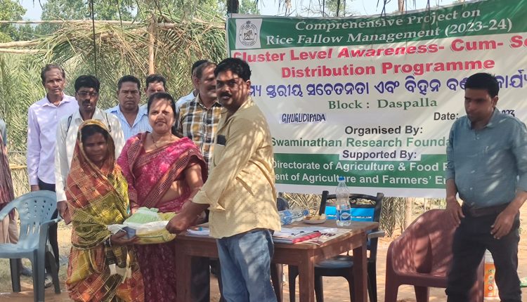ଦଶପଲ୍ଲା : ଜୟପୁରର ଅଗ୍ରଣୀ ସ୍ୱେଚ୍ଛାସେବୀ ସଂଗଠନ ସ୍ୱାମୀନାଥନ୍‌ ଫାଉଣ୍ଡେସନ ତରଫରୁ ଦଶପଲ୍ଲା ବ୍ଲକ୍‌ର ଆଦିବାସୀ ଅଧ୍ୟୁଷିତ ଘୁଗୁଡିପଡା ଗ୍ରାମ ପଂଚାୟତର ପ୍ରାୟ ୨୦୦ରୁ ଅଧିକ ଚାଷୀ ମାନଙ୍କୁ ଉନ୍ନତମାନର ବିରି ବିହନ କିଟ୍‌ ସହିତ ମୃତ୍ତିକା ବିଶୋଧନ ନିମନ୍ତେ ଆବଶ୍ୟକୀୟ ବିଶୋଧନ ସାମଗ୍ରୀ ପ୍ରଦାନ କରାଯାଇଛି । ଚାଷୀମାନେ କିଭଳି ଭାବରେ ଅଳ୍ପ ଜଳ ଓ ଅଳ୍ପ ପରିଶ୍ରମ କରି ରବି ଓ ଡାଲି ଜାତୀୟ ଫସଲରୁ ଅଧିକ ଲାଭବାନ ହୋଇପାରିବେ ସେ ବିଷୟରେ କର୍ମକର୍ତ୍ତାମାନେ ପରାମର୍ଶ ଦେଇଥିଲେ । ଆଜିର ଏହି କାର୍ଯ୍ୟକ୍ରମରେ ଦଶପଲ୍ଲା ବ୍ଲକ୍‌ ଚେୟାରମ୍ୟାନ ସୁନନ୍ଦା ସାହୁ ଯୋଗଦେଇ ଚାଷୀମାନଙ୍କ ଉନ୍ନତି ପାଇଁ ଥିବା ବିଭିନ୍ନ ଯୋଜନା ବିଷୟରେ ଚାଷୀ ମାନଙ୍କୁ ବୁଝାଇଥିଲେ । ସ୍ୱାମୀନାଥନ୍‌ ଫାଉଣ୍ଡେସନ୍‌ର ସଂଯୋଜକ ସୂର୍ଯ୍ୟମଣୀ ପଣ୍ଡାଙ୍କ ପ୍ରତ୍ୟକ୍ଷ ତତ୍ତ୍ୱାବଧାନରେ ଅନୁଷ୍ଠିତ ଏହି କାର୍ଯ୍ୟକ୍ରମରେ ଦଶପଲ୍ଲା କୃଷି ବିଭାଗର କୃଷି ବିକାଶ ଅଧିକାରୀଙ୍କ ସମେତ, ଗ୍ରାମସେବକ ଦୁଃଖିଶ୍ୟାମ ନାଥ ଉପସ୍ଥିତ ରହିଥିବାବେଳେ ସ୍ଥାନୀୟ ସରପଞ୍ଚ ରମେଶ ଚନ୍ଦ୍ର ସାହୁ କାର୍ଯ୍ୟକ୍ରମ ପରିଚାଳନା କରିଥିଲେ ।