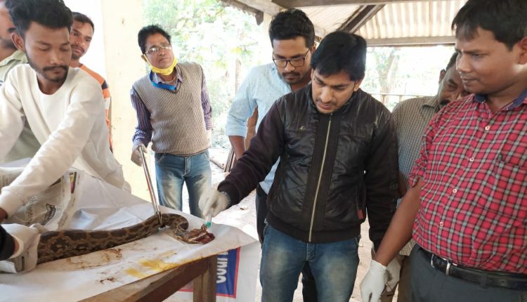 ଖପ୍ରାଖୋଲ : ବଲାଙ୍ଗିର ଜିଲ୍ଲା ଖପ୍ରାଖୋଲ ବ୍ଲକ୍ ବଡଗୁର୍ଜିଭଟା ଗାଁ ନିକଟ ଏକ ଚାଷ ଜମିରୁ ବନ ବିଭାଗ ଦ୍ୱାରା ଉଦ୍ଧାର ବିରଳ ଅଜଗର ସାପର ଚିକିତ୍ସାଧିନ ଅବସ୍ଥାରେ ଶୁକ୍ରବାର ମୃତ୍ୟୁ ହୋଇଥିବା ଜଣାଯାଇଛି । ସୂଚନା ଅନୁସାରେ ଗୁରୁବାର ଅଜଗର ସାପଟିକୁ ବଡଗୁର୍ଜିଭଟା ଗାଁ ନିକଟରୁ ଉଦ୍ଧାର କରିଥିଲେ । ସାପଟି ବିରଳ ଅଜଗର ପ୍ରଜାତିର ହୋଇଥିବା ବେଳେ ଲମ୍ବ ୮ ଫୁଟ ଥିବା ଜଣାଯାଇଛି । ହେଲେ ସାପଟିର ମୁଣ୍ଡରେ ଗଭୀର ଆହତ ଥିବାରୁ ବନବିଭାଗ ଉଦ୍ଧାର କରି ପ୍ରାଣୀ ଚିକିତ୍ସାଲୟରେ ଚିକିତ୍ସା କରିଥିଲେ । ଦୁଇଦିନ ଧରି ପ୍ରାଣୀ ଚିକିତ୍ସା ଅଧିକାରୀ ଡ଼ା.ସୁଜିତ କୁମାର ଶତପଥୀଙ୍କ ଉଦ୍ୟମ ପରେ ମଧ୍ୟ ଶେଷରେ ସାପଟିର ମୃତ୍ୟୁ ହୋଇଥିବା ଜଣାଯାଇଛି । ସାପଟି କିଭଳି ଆହତ ହୋଇଥିଲା ସେ ନେଇ ବନବିଭାଗ ତରଫରୁ ତଦନ୍ତ ଚାଲିଛି । ଅଭିଯୁକ୍ତକୁ ଚିହ୍ନଟ ପରେ ଆଇନ ଅନୁଯାୟୀ କାର୍ଯ୍ୟାନୁଷ୍ଠାନ ଗ୍ରହଣ କରାଯିବ ବୋଲି ହରିଶଙ୍କର ବନ ବିଭାଗ ରେଞ୍ଜ ଅଧିକାରୀ ଗିରିଧାରୀ ନାଗ ପ୍ରକାଶ କରିଛନ୍ତି ।