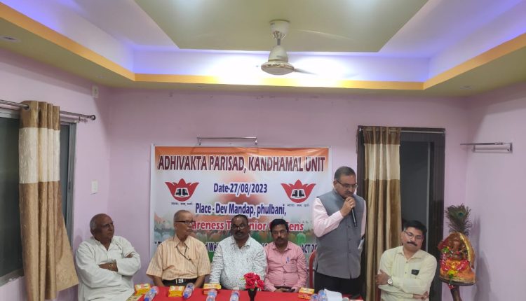 ଫୁଲବାଣୀ : ଫୁଲବାଣୀ ସହରର ସ୍ଥାନୀୟ ଦେବ କଲ୍ୟାଣ ମଣ୍ଡପ ଠାରେ ଅଧିବକ୍ତା ପରିଷଦ କନ୍ଧମାଳ ଶାଖା ତରଫରୁ ଆୟୋଜିତ କାର୍ଯ୍ୟକ୍ରମରେ ବରିଷ୍ଠ ନାଗରିକ କମଳା କାନ୍ତ ପାଣ୍ଡେ, ଡଃ ଅନନ୍ତ ଚରଣ ମିଶ୍ର, ଓକିଲ ସଂଘର ସଭାପତି ଆଇନଜୀବୀ ଭଗବାନ ମହାନ୍ତି, ସମାଲୋଚକ ତଥା ବରିଷ୍ଠ ଆଇନଜୀବୀ ବିଜୟ କୃଷ୍ଣ ପଟ୍ଟନାୟକ, ଭିଜିଲାନ୍ସ ସ୍ପେଶାଲ ପ୍ରସିକ୍ୟୁଟର ଭି ଭି ରାମଦାସ, ଅଜିତ କୁମାର ପଟ୍ଟନାୟକ ପ୍ରମୁଖ ମଞ୍ଚାସୀନ ଥିଲେ । ଅନ୍ୟମାନଙ୍କ ମଧ୍ୟରେ ଆଇନଜୀବୀ ରମେଶ ଚନ୍ଦ୍ର ମହାନ୍ତି, ରମେଶ ସାହୁ, ଆଦିତ୍ୟ ପ୍ରସାଦ ତ୍ରିପାଠୀ, ସଦାଶିବ ପାତ୍ର, ଅଶୋକ କୁମାର ପରିଡ଼ା, ନମିତା ସାହୁ, ନନ୍ଦିତା କୁମାରୀ, ସୁଧୀନ୍ଦ୍ର ସାହୁଙ୍କ ସମେତ ବରିଷ୍ଠ ନାଗରିକ ସଂଘର ପ୍ରାୟ ୩୦ରୁ ଊର୍ଦ୍ଧ୍ୱ ସଦସ୍ୟ ଉପସ୍ଥିତ ଥିଲେ । ବରିଷ୍ଠ ନାଗରୀକଙ୍କୁ ବହୁ ସମୟରେ ପାରିବାରିକ ନିର୍ଯାତନା ସହିତ ବ୍ୟାଙ୍କ ମାନଙ୍କରେ ମେଡିକାଲ କ୍ଷେତ୍ରରେ କିପରି ଘଣ୍ଟା ଘଣ୍ଟା ଧରି ଅପେକ୍ଷା କରିବାକୁ ପଡୁଛି ସେ ସବୁ ବିଷୟରେ ଆଲୋଚିତ କରାଯାଇ ତାର ସୁରକ୍ଷା ବିଷୟରେ ଆଇନ ପରାମର୍ଶ ଦିଆଯାଇଥିଲା ।