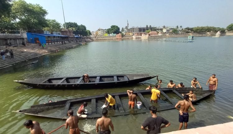 ପୁରୀ : ପବିତ୍ର ଚୈତ୍ର ପୂର୍ଣ୍ଣିମା ଅବସରରେ ନରେନ୍ଦ୍ର ପୁଷ୍କରିଣୀରୁ କଢାଯାଇଛି ନନ୍ଦା ଓ ଭଦ୍ରା ଚାପ । ଅକ୍ଷୟ ତୃତୀୟାରେ ମହାପ୍ରଭୁଙ୍କ ପ୍ରସିଦ୍ଧ ଚନ୍ଦନଯାତ୍ରାର ଶୁଭାରମ୍ଭ ହେଉଥିବା ସ୍ଥଳେ ନରେନ୍ଦ୍ର ଜଳରେ ବୁଡି଼ ରହିଥିବା ନନ୍ଦା, ଭଦ୍ରା ଡଙ୍ଗାକୁ କଢା ଯାଇଛି । ନରେନ୍ଦ୍ର ପାହାଚରେ ୫ଟି ଡଙ୍ଗା ସାଇତା ଯାଇଛି । ୩୦ ଜଣ ଭୋଇ ସେବକ ଏହି କାର୍ଯ୍ୟ ସମ୍ପାଦନ କରିଛନ୍ତି ।
