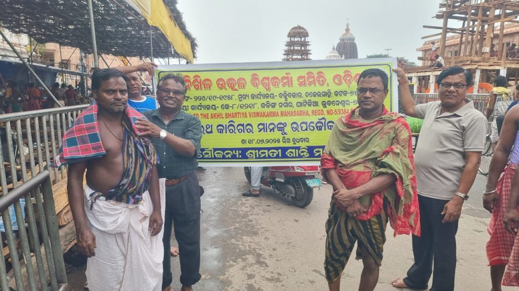 ପୁରୀ- ନିଖିଳ ଉତ୍କଳ ବିଶ୍ଵକର୍ମା ସମିତି ଓଡିଶା ଆନୁକୁଲ୍ୟରେ ସମାଜସେବୀ ଶାନ୍ତି ମହାରଣାଙ୍କ ସୌଜନ୍ୟରୁ ରଥ କାରିଗର ମାନଙ୍କୁ ଉପଢୌକନ ପ୍ରଦାନ ପୂର୍ବକ ସମ୍ବର୍ଦ୍ଧିତ କରାଯାଇଛି। ବୁଧବାର ରଥଖଳାରେ ସମିତିର ପ୍ରାଦେଶିକ ସଭାପତି ଇଂ ରାମକୃଷ୍ଣ ମହାରଣା ତିନିରଥ ର ମୁଖ୍ୟ ମହାରଣା,ଭୋଇ ସର୍ଦ୍ଦାର ଏବଂ ମୁଖ୍ୟ ଓଝା ମହାରଣାଙ୍କୁ ଉପଢୌକନ ପ୍ରଦାନକରି ସମ୍ବର୍ଦ୍ଧିତ କରିଥିଲେ।