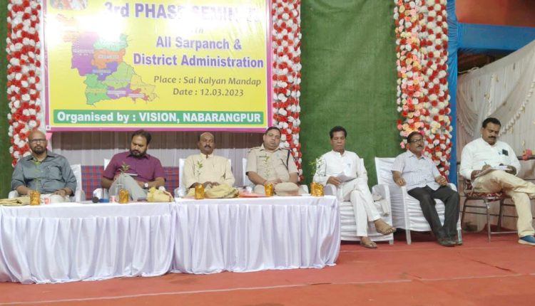 ନବରଙ୍ଗପୁର: ଭିଜନ, ନବରଙ୍ଗପୁରର ତୃତୀୟ ପର୍ଯ୍ୟାୟ ଆଲୋଚନା ଅନୁଷ୍ଠିତ ହୋଇଯାଇଛି । ଏଥିରେ ଜିଲ୍ଲାର ସମସ୍ତ ୧୦ ଗୋଟି ବ୍ଲକର ସରପଞ୍ଚମାନେ ଯୋଗ ଦେଇଥିଲେ । ଜିଲାପାଳ ଡ଼ଃ. କମଳ ଲୋଚନ ମିଶ୍ର ଯୋଗଦେଇ ଭିଜନ, ନବରଙ୍ଗପୁର ଜିଲା ବିକାଶର ଏକ ଦୃଷ୍ଟିଭଙ୍ଗୀର ପ୍ଲାଟଫର୍ମ ବୋଲି କହିଥିଲେ । ଜିଲା ପ୍ରଶାସନ ଓ ସରପଞ୍ଚଙ୍କ ମିଳିତ ଉଦ୍ୟମରେ ବିକାଶ ହୋଇପାରିବ । ସରପଞ୍ଚଙ୍କ ଅଭିଜ୍ଞତା, ଦୃଷ୍ଟିଭଙ୍ଗୀ ଓ କାର୍ଯ୍ୟ ସଂପର୍କରେ ଗୁରୁତ୍ୱ ଦେଇଥିଲେ । ସରପଞ୍ଚମାନେ ତୃଣମୂଳସ୍ତରରୁ ଆସିଛନ୍ତି । ସେମାନେ ସମସ୍ୟା ସମ୍ପର୍କରେ ସଚେତନ ଅଛନ୍ତି । ତେବେ ସମସ୍ୟାର ସମାଧାନ ଉପରେ ଧାରଣା ନାହିଁ । ଏଥିପ୍ରତି ଗୁରୁତ୍ୱ ଦେବାକୁ ହେବ ବୋଲି କହିଥିଲେ । ଲୋକଙ୍କ ସମସ୍ୟାର ସମାଧାନ ଉଦ୍ୟମ କରି ଭଲ କରିବାର ବାଟ ଖୋଜିବାକୁ ପରାମର୍ଶ ଦେଇଥିଲେ । ସରପଞ୍ଚ ସେମାନଙ୍କର ଅଞ୍ଚଳରେ ହେଉଥିବା ଉନ୍ନୟନ କାର୍ଯ୍ୟ ପ୍ରତି ଧ୍ୟାନ ଦେବା ଉଚିତ । ପଂଚାୟତର ବିକାଶ ପାଇଁ ଯୋଜନା ପ୍ରସ୍ତୁତ କରିବାକୁ ଗୁରୁତ୍ୱ ଦେବା ସହିତ ଭିଜନ ପଦକ୍ଷେପକୁ ପ୍ରଶଂସା କରିଥିଲେ । ଜିଲା ପରିଷଦ ଅଧ୍ୟକ୍ଷ ମୋତିରାମ ନାୟକ ଜିଲାର ବିକାଶର ଆଶା, ଚିନ୍ତାଧାରାର ସ୍ୱପ୍ନ ଭିଜନ ମାଧ୍ୟମରେ ପୁରା ହେବ । ସରପଞ୍ଚ ମାନେ ନିଜ ପଞ୍ଚସୂତ୍ରୀ କାମ କରି ନାଁ କୋରିବାକୁ ପରାମର୍ଶ ଦେଇଥିଲେ । ଜିଲାବାସୀଙ୍କର ଦୂରଦୃଷ୍ଟି ବିଚାର, ସ୍ୱପ୍ନକୁ ସାକାର କରିବା ପାଇଁ ଭିଜନର ପ୍ରୟାସ ଜାରି ରଖି ହେଲିପେଡ ନିର୍ମାଣ ପାଇଁ ପ୍ରସ୍ତାବ ଦିଆଯାଇଛି । ପର୍ଯ୍ୟଟନ ପାଇଁ ଉଦ୍ୟମ ଆରମ୍ଭ କରାଯାଉଛି ବୋଲି କହିଥିଲେ । ଉପଜିଲାପାଳ ପ୍ରଶାନ୍ତ କୁମାର ରାଉତ ଆଦିବାସୀ ଅଧ୍ୟୁଷିତ ଏହି ଜିଲାରେ ବିକାଶ କାର୍ଯ୍ୟ ଚାଲିଛି । କେରଳ ରାଜ୍ୟର ପ୍ରତି ଗ୍ରାମ ପଞ୍ଚାୟତରେ ବାର୍ଷିକ ୧୫ କୋଟି ପର୍ଯ୍ୟନ୍ତ ଆଦାୟ କରାଯାଉଛି । ଏଭଳି ଯୋଜନା ଏହି ଜିଲାର ସରପଞ୍ଚ ମାନେ ପଦକ୍ଷେପ ନେବାକୁ କହିଥିଲେ । ଜିଲା ପଂଚାୟତ ଅଧିକାରୀ ଶିଶିର କୁମାର ପାଣି ସରପଞ୍ଚଙ୍କର କାର୍ଯ୍ୟ ଓ ଭୂମିକା ସଂପର୍କରେ ଅବଗତ କରାଇଥିଲେ । ଜିଲା ସରପଞ୍ଚ ସଙ୍ଘ ସଭାପତି ଜଳଧର ମାଝୀ ପ୍ରତି ପଞ୍ଚାୟତରେ ଜିମ କେନ୍ଦ୍ର, ଗୋଶାଳା ଖୋଲିବା, ପ୍ରତ୍ୟେକ ଶ୍ମଶାନରେ ପାଚେରୀ ନିର୍ମାଣ, ପିପିପି ମୋଡରେ ପର୍ଯ୍ୟଟନର ବିକାଶ, ଦୀପା ଯୋଜନା କାର୍ଯ୍ୟକାରୀ କରିବାକୁ ପ୍ରସ୍ତାବ ଦେଇଥିଲେ । ଅତିରିକ୍ତ ଏସପି ଡ଼ଃ ଚନ୍ଦ୍ର ଶେଖର ହୋତା ମଞ୍ଚସିନ ଥିଲେ । କୋଷଗୁମୁଡା ବିଡ଼ିଓ ସୁକାନ୍ତ କୁମାର ପଟ୍ଟନାୟକ ତାଙ୍କର ବ୍ଲକର ସଫଳତା ସମ୍ପର୍କରେ ଅବଗତ କରାଇଥିଲେ । ଏହି ଅବସରରେ ସରପଞ୍ଚ ମାନେ ଜିଲାର ବିଭିନ୍ନ ସମସ୍ୟା ଶିକ୍ଷା, ସ୍ୱାସ୍ଥ୍ୟ, ଜଳସେଚନ, ଗମନାଗମନ, ଆଡ଼ିବନ୍ଧ ନିର୍ମାଣ ଇତ୍ୟାଦି ସମ୍ପର୍କରେ ଅବଗତ କରାଇବା ସହିତ ସମାଧାନ ପାଇଁ ପ୍ରସ୍ତାବ ଦେଇଥିଲେ । ଜିଲା ସରପଞ୍ଚ ସଂଘର ସମ୍ପାଦକ କୃଷ୍ଣଚନ୍ଦ୍ର ଭତରା ସରପଞ୍ଚମାନେ ଜିଲା ବିକାଶରେ ସହଭାଗୀ ହୋଇ କାମ କରୁଥିବା କହିଥିଲେ । ସାମ୍ବାଦିକ ଭାଗିରଥି ମଲ୍ଲିକ, ପ୍ରଭଞ୍ଜନ ତ୍ରିପାଠୀ ଜିଲାର ସମସ୍ୟା ସମ୍ପର୍କରେ ଅବଗତ କରାଇଥିଲେ । ଭିଜନର ସଂଯୋଜକ ବାଙ୍କ ବିହାରୀ ବିଷୋୟୀ ମଞ୍ଚ ପରିଚାଳନା କରିଥିଲେ । ଆବାହକ ବିରେନ୍ଦ୍ର କୁମାର ନାୟକ ଧନ୍ୟବାଦ ଅର୍ପଣ କରିଥିବାବେଳେ ସହ-ସଂଯୋଜକ ରାମଚନ୍ଦ୍ର ଦଳେଇ ସହଯୋଗ କରିଥିଲେ । ଏଥିରେ ସମସ୍ତ ଜିଲ୍ଲାସ୍ତରୀୟ 
