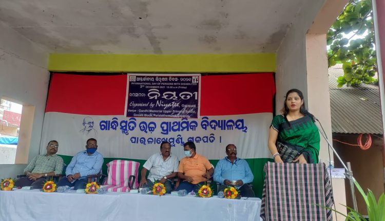 ପାରଳାଖେମୁଣ୍ଡି:ଗଜପତି ଜିଲ୍ଲା ସଦରମହକୁମା ପାରଳାଖେମୁଣ୍ଡି ସହରସ୍ଥ ଗାନ୍ଧୀମେମୋରିଆଲ ସ୍କୁଲ ପରିସରରେ ନିୟତୀ ମାନସିକ ଅନଗ୍ରସର ବିଦ୍ୟାଳୟ ( ଦିବ୍ୟଙ୍ଗ) ସ୍କୁଲ ପକ୍ଷରୁ ବିଶ୍ୱ ଭିନ୍ନକ୍ଷମ ଦିବସ ପାଳିତ ହୋଇଯାଇଛି । ଏହି ଅବସରରେ ଏକ ସଚେତନତା ଶିବିର ଓ କର୍ମଶାଳା ଅନୁଷ୍ଠିତ ହୋଇଥିଲା । ଏଥିରେ ମୁଖ୍ୟ ଅତିଥି ରୂପେ ସ୍ମାର୍ଟ ସ୍କୁଲ ର ପ୍ରତିଷ୍ଠାତା ଶ୍ରୀମତୀ ସ୍ୱାଗତିକା ମିଶ୍ର, ସ୍ୱତନ୍ତ୍ର ଅତିଥି ଭାବେ ସି ସି ଡି ର ପ୍ରତିଷ୍ଠାତା ଏବଂ ସମ୍ପାଦକ ଏ.ଜଗନ୍ନାଥ ରାଜୁ ଯୋଗଦେଇ ମାନସିକ ସୁସ୍ଥ ରହିବାକୁ ହେଲେ କିଭଳି ଆମକୁ ସଜାଗ ରହିବାକୁ ହେବ ଏବଂ ସେହିପିଲାଙ୍କୁଆ ଏବଂ ବ୍ୟକ୍ତିମାନଙ୍କୁ ସମାଜର ମୁଖ୍ୟ ସ୍ରୋତରେ ସାମିଲ କରିବାପାଇଁ ସମାଜର ପ୍ରତିଟିବର୍ଗର ଲୋକଙ୍କୁ ଏହି କାର୍ଯ୍ୟକ୍ରମରେ ସାମିଲ ହେବାକୁ ଆହ୍ୱାନ କରୁଥିଲେ ।ସମର୍ଥର ସମ୍ପାଦକ ସନ୍ତୋଷ ମହାରଣା ସରକାରଙ୍କ ବିଭିନ୍ନ ହିତକର ଯୋଜନା ସମ୍ପର୍କରେ ବୁଝାଇଥିଲେ । ଭିନ୍ନକ୍ଷମ ହେଲେ ହେଁ ପ୍ରତ୍ୟେକ ନାଗରିକଙ୍କ ମୌଳିକ ଅଧିକାରକୁ ଗୁରୁତ୍ୱ ଦେବାପାଇଁ ଆଜିର ମୁଖ୍ୟ ଅତିଥି ଶ୍ରୀମତୀ ସ୍ୱାଗତିକା ମିଶ୍ର ଗୁରୁତ୍ୱାରୋପ କରିଥିଲେ । ଅତିଥି ସିସିଡିର ମୁଖ୍ୟ ଜଗନ୍ନାଥ ରାଜୁ ବିଭିନ୍ନ ସରକାରୀ ଯୋଜନା ଓ ଭିନ୍ନକ୍ଷମ ପାଇଁ ରହିଥିବା ବିଭିନ୍ନ ମାଗଣା ଆଇନ ସେବା ସମ୍ପର୍କରେ ଆଲୋଚନା କରିଥିଲେ । ଡାକ୍ତର ଅରୁଣ ନାୟକ ଯୋଗଦେଇ ଭିନ୍ନକ୍ଷମଙ୍କ ପାଇଁ ରହିଥିବା ସରକାରଙ୍କ ବିଭିନ୍ନ ନିୟମ ଓ ଏହାର କାର୍ଯ୍ୟକାରିତା ଉପରେ ଆଲୋକପାତ କରିଥିଲେ । ଏହି କାର୍ଯ୍ୟକ୍ରମ ରେ ବହୁ ଦିବ୍ୟଙ୍ଗ ଛାତ୍ରଛାତ୍ରୀ ଉପସ୍ଥିତ ରହିଥିଲେ । ନିୟତୀ ସ୍କୁଲର ପ୍ରତିଷ୍ଠାତା ବିଚିତ୍ରାନନ୍ଦ ବେବର୍ତ୍ତା ଏହି କାର୍ଯ୍ୟକ୍ରମକୁ ପରିଚାଳନା କରିଥିଲେ । ବିଦ୍ୟାଳୟର ପ୍ରଧାନ ଶିକ୍ଷକ ଏସ୍ ତିରୁପତି ବିଶ୍ୱ ଭିନ୍ନକ୍ଷମ ଦିବସ ପାଳିତର ତାତ୍ପର୍ଯ୍ୟ ବୁଝାଇଥିଲେ । ଏହି ଅବସରରେ ଏକ ସଚେତନତା ଶିବିର ଅନୁଷ୍ଠିତ ହୋଇଥିଲା । ଶ୍ରୀ ବେବର୍ତ୍ତା ମାନସିକ ସୁସ୍ଥ ରହିବାକୁ ହେଲେ କିଭଳି ଆମକୁ ସଜାଗ ରହିବାକୁ ହେବ ସେ ବିଷୟରେ ବୁଝାଇଥିଲେ । ଭିନ୍ନକ୍ଷମ ହେଲେ ହେଁ ପ୍ରତ୍ୟେକ ନାଗରିକଙ୍କ ମୌଳିକ ଅଧିକାରକୁ ଗୁରୁତ୍ୱ ଦେବାପାଇଁ ସେ ଗୁରୁତ୍ୱାରୋପ କରିଥିଲେ । ସମ୍ମାନିତ ଅତିଥି ଭାବେ ସିସିଡିର ମୁଖ୍ୟ ଜଗନ୍ନାଥ ରାଜୁ ବିଭିନ୍ନ ସରକାରୀ ଯୋଜନା ଓ ଭିନ୍ନକ୍ଷମ ପାଇଁ ରହିଥିବା ବିଭିନ୍ନ ମାଗଣା ଆଇନ ସେବା ସମ୍ପର୍କରେ ଆଲୋଚନା କରିଥିଲେ । ଯୋଗଦେଇ ଭିନ୍ନକ୍ଷମଙ୍କ ପାଇଁ ରହିଥିବା ସରକାରଙ୍କ ବିଭିନ୍ନ ନିୟମ ଓ ଏହାର କାର୍ଯ୍ୟକାରିତା ଉପରେ ଆଲୋକପାତ କରିଥିଲେ । ଏହି କାର୍ଯ୍ୟକ୍ରମରେ ବହୁ ଦିବ୍ୟଙ୍ଗ ଛାତ୍ରଛାତ୍ରୀ ଉପସ୍ଥିତ ରହିଥିଲେ । ନିୟତୀ ସ୍କୁଲର ସେ ପ୍ରତିଷ୍ଠାତା ବିଚିତ୍ରାନନ୍ଦ ବେବର୍ତ୍ତା ଏହି କାର୍ଯ୍ୟକ୍ରମକୁ ପରିଚାଳନା କରିଥିଲେ । ଶେଷରେ ଶିକ୍ଷୟତ୍ରୀ ସଂଗୀତା ପାତ୍ର ଧନ୍ୟବାଦ ଦେଇଥିଲେ । ଶେଷରେ ତାନିଶା ବେବର୍ତ୍ତା ଓଡ଼ିଶୀ ନୃତ୍ୟ ପରିବେଷଣ କରିଥିଲେ । ରୁପାଞ୍ଜଳି ମହାନ୍ତି, ସୁନିଲ ଗମାଙ୍ଗ, ସୁନିତ ଗମଙ୍ଗ, କୁମାରୀ, ସ୍ନେହଲତା ପାଣିଗ୍ରାହୀ, ଶାଶ୍ୱତୀ ବେବର୍ତ୍ତା, ମୁରଲୀ ନିତ୍ୟାନନ୍ଦ ପ୍ରଭୃତି କାର୍ଯ୍ୟକ୍ରମକୁ ପରିଚାଳନା କରିଥିଲେ ।