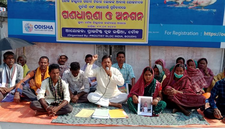 ବୌଦ୍ଧ,୧୧/୧- ବୌଦ୍ଧ ଜିଲ୍ଲାରେ ଗରୀବ ଲୋକଙ୍କୁ ମିଳୁଥିବା ଆବାସ ଯୋଜନାରେ ବ୍ୟାପକ ଦୁର୍ନୀତି ଓ ଅନିୟମିତତା ପ୍ରତିବାଦରେ ଆଜି ପ୍ରାଉଟିଷ୍ଟ ବ୍ଲକ୍ ଇଣ୍ଡିଆ ବୌଦ୍ଧ ଜିଲ୍ଲା ଶାଖା ପକ୍ଷରୁ ଜିଲ୍ଲାପାଳଙ୍କ କାର୍ଯ୍ୟାଳୟ ଆଗରେ ଅନଶନ ଓ ଗଣ ଧାରଣା ଦିଆଯାଇଥିଲା | ବୌଦ୍ଧ ଜିଲ୍ଲାରେ ଆବାସ ଯୋଜନାରେ ଅନେକ ଘର ହଡ଼ପ ହେବା, କାହାର ଘର ଚୋରୀ ହେବା, ଅନ୍ୟ ଜମା ଖାତାକୁ ଟଂକା ଯିବା, ହିତାଧିକାରୀଙ୍କ ମନରେଗା ଶ୍ରମିକଙ୍କ ଟଂକା ମୃତ ଲୋକଙ୍କ ନାମରେ ହଡ଼ପ ହେବା, ବୋନସ ଟଂକା ଅନ୍ୟ ଖାତାକୁ ପଠାଇବା ଆଦି ଦୁର୍ନୀତିର ପ୍ରତିବାଦ କରାଯାଇଥିଲା | ଏସ.ଇ.ସି.ସି. ତାଲିକା ଭୁକ୍ତ ହିତାଧିକାରୀଙ୍କ ତାଲିକାକୁ ବାଦ ଦେଇ ନଥିବା ଲୋକଙ୍କୁ ଘର ଦେବା ଭଳି ଦୁର୍ନୀତି କୁ ପି.ବି.ଆଇ. କର୍ମୀମାନେ ପ୍ରତିବାଦ କରିବା ସହ ଏ ସମ୍ପର୍କରେ ତୁରନ୍ତ ପ୍ରଶାସନିକ ସ୍ତରରେ ପଦକ୍ଷେପ ନେବାକୁ ଦାବୀ କରିଥିଲେ | ଆଜି ସକାଳ 10 ଘଣ୍ଟା ସମୟ ଠାରୁ ଅପରାନ୍ହ 5 ଘଣ୍ଟା ପର୍ଯ୍ୟନ୍ତ କର୍ମୀମାନେ ଧାରଣାରେ ବସି ରହିଥିଲେ l କେଦାର ନାଥ ସାହୁଙ୍କ ନେତୃତ୍ବରେ ଅନୁଷ୍ଠିତ ଅନଶନ ଓ ଗଣ ଧାରଣା କାର୍ଯ୍ୟକ୍ରମରେ ଶ୍ରୀ ଧର ଘିବେଲା, ଚମ୍ପେଶ୍ୱର ଦନ୍ତା, ଧରଣୀଧର ଲଉରିଆ, ଅରୁଣ କୁମାର୍ ପ୍ରଧାନ, ରାମଚନ୍ଦ୍ର ଦୀପ, ଜୋଗୀନ୍ଦ୍ର କନ୍ହର, କୌଶିକ ଜଟି, ସନ୍ତୋଷ କୁମାର ସାହୁ, ଆଦିତ୍ୟ ପ୍ରଧାନ ପ୍ରମୁଖ ଅଂଶଗ୍ରହଣ କରି ଥିଲେ l