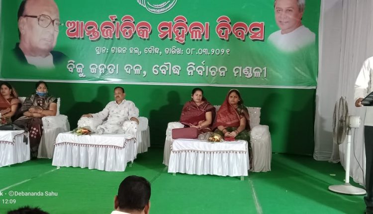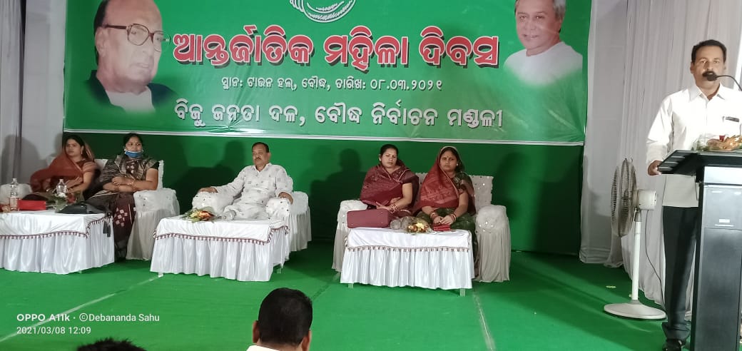 ବୌଦ୍ଧ ,୮/୩- ବୌଦ୍ଧ ନିର୍ବାଚନ ମଣ୍ଡଳୀ ବିଜୁ ଜନତା ଦଳ ପକ୍ଷରୁ ଆନ୍ତର୍ଜାତିକ ମହିଳା ଦିବସ ପାଳିତ ହୋଇ ଯାଇଛି | ବୌଦ୍ଧ ଟାଉନ୍ ହଲ୍ ଠାରେ ଅନୁଷ୍ଠିତ ମହିଳା ଦିବସ ରେ ମୁଖ୍ୟ ଅତିଥି ଭାବରେ ବୌଦ୍ଧ ବିଧାୟକ ପ୍ରଦୀପ କୁମାର ଅମାତ୍ ଯୋଗ ଦେଇ ରାଜ୍ୟ ସରକାର ମହିଳା ମାନଙ୍କ ପାଇଁ ପ୍ରଣୟଣ କରି ଥିବା ବିଭିନ୍ନ ଯୋଜନାର ଉପାଦେୟତା ଉପରେ ଆଲୋକପାତ କରିଥିଲେ | ବୌଦ୍ଧ ଏନଏସି ର ପୂର୍ବତନ ଅଧ୍ୟକ୍ଷା ଶ୍ରୀମତୀ ଦୀପ୍ତି ପ୍ରଭା ସ୍ୱାଇଁଙ୍କ ସଭାପତିତ୍ବରେ ଅନୁଷ୍ଠିତ ସଭାରେ 5 ନମ୍ବର ଜିଲ୍ଲା ପରିଷଦ ସଦସ୍ୟା ସସ୍ମିତା ମଲ୍ଲିକ, ଜିଲ୍ଲା ମହିଳା ବିଜେଡ଼ି ସଭାନେତ୍ରୀ ଜଶ୍ମିନ୍ ପ୍ରଧାନ, ବଘିଆପଡା ଗ୍ରାମ ପଞ୍ଚାୟତ ସରପଞ୍ଚ ସୈରେନ୍ଦ୍ରୀ ମହାକୁଳ ପ୍ରମୁଖ ମଞ୍ଚାସୀନ ଥିଲେ l ସଭାରେ ବିଜେଡ଼ି ର ଅନେକ ମହିଳା ପ୍ରତିନିଧିଙ୍କ ସମେତ ଦଳୀୟ କର୍ମୀ ଯୋଗଦାନ କରିଥିଲେ |