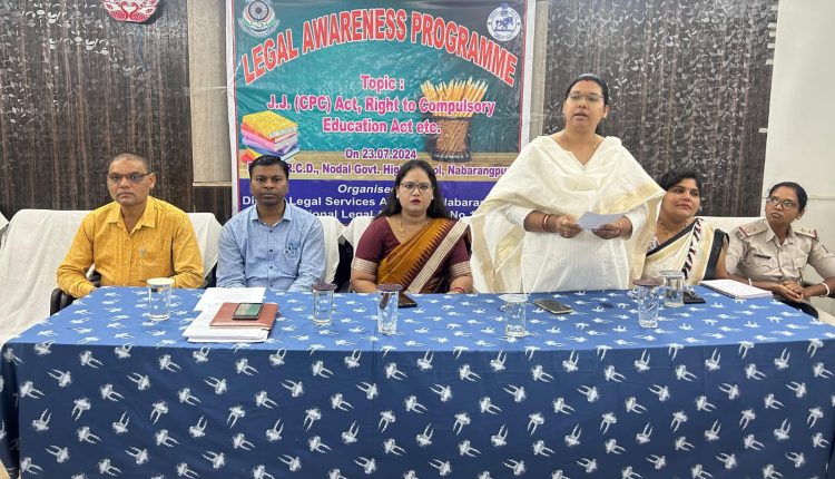 ନବରଙ୍ଗପୁର : ଜିଲ୍ଲା ଆଇନ ସେବା ପ୍ରାଧିକରଣ, ନବରଙ୍ଗପୁର ତରଫରୁ ଆର.ସି.ଡ଼ି ନୋଡାଲ ଉଚ ବିଦ୍ୟାଳୟ, ନବରଙ୍ଗପୁର ପ୍ରାଙ୍ଗଣରେ “ଶିଶୁ ଯତ୍ନ ଓ ଶିଶୁ ସୁରକ୍ଷା ଆଇନ ଏବଂ ଶିକ୍ଷା ଅଧିକାର ଆଇନ” କୁ ନେଇ ଏକ ଆଇନ ସଚେତନତା ଶିବିର ଅନୁଷ୍ଟିତ ହୋଇଯାଇଛି। ଏହି କାର୍ଯ୍ୟକ୍ରମ ଜିଲ୍ଲା ଆଇନ ସେବା ପ୍ରାଧିକରଣ, ନବରଙ୍ଗପୁରର ଅଧ୍ୟକ୍ଷ ତଥା ଜିଲ୍ଲା ଦୌରାଜର୍ଜ ସୁବ୍ରତ ମହାନ୍ତିଙ୍କ ନିର୍ଦ୍ଦେଶ କ୍ରମେ ଆୟୋଜିତ ହୋଇଥିଲା । ଏହି କାର୍ଯ୍ୟକ୍ରମରେ ଜିଲ୍ଲା ଆଇନ ସେବା ପ୍ରାଧିକରଣର ସଚିବ ସାଇ ଅଭିସ୍ପା ଗୋଛାୟତ ଯୋଗଦେଇ ଛାତ୍ରଛାତ୍ରୀ ମାନଙ୍କୁ ଶିଶୁ ସୁରକ୍ଷା ଆଇନ ବିଷୟରେ ଆଲୋକପାତ କରିଥିଲେ। ଅତିରିକ୍ତ ଜିଲ୍ଲା ଶିକ୍ଷା ଅଧିକାରୀ ରେଶମ ଲାଲ ନାୟକ ଯୋଗଦେଇ ଛାତ୍ରଛାତ୍ରୀ ମାନଙ୍କୁ ଶିକ୍ଷା ଅଧିକାର ଆଇନ, ଜିଲ୍ଲା ଶିଶୁ ସୁରକ୍ଷା ଅଧିକାରୀ, ନବରଙ୍ଗପୁର ଶ୍ରୀଯୁକ୍ତ ସୁରେଶ କୁମାର ପଟ୍ଟନାୟକ, ଅଧକ୍ଷ୍ୟା ଜିଲ୍ଲା ଶିଶୁ କଲ୍ୟାଣ ସମିତି, ନବରଙ୍ଗପୁର ଅଜନ୍ତା ସୁଭଦର୍ଶିନୀ ଶିଶୁ ସୁରକ୍ଷା ଆଇନ ବିଷୟରେ ଆଲୋକପାତ କରିଥିଲେ। ଅନ୍ୟାନ୍ୟ ଅତିଥି ରୂପେ ସୁପ୍ରିୟା ନାୟକ, ପ୍ରଧାନ ଶିକ୍ଷକ ଆର.ସି.ଡ଼ି ନୋଡାଲ ଉଚ୍ଚ ବିଦ୍ୟାଳୟ, ନବରଙ୍ଗପୁର, ଆଇନ ଜିବୀ କିଶୋରି ପଟ୍ଟନାୟକ, ଆଇନଜୀବି ରାଜ କିଶୋର ନାଗ ଯୋଗ ଦେଇଥିଲେ। ଏହି ସଚେତନତା ଶିବିରରେ ସୁପ୍ରିୟା ନାୟକ, ପ୍ରଧାନ ଶିକ୍ଷକ ଆର.ସି.ଡ଼ି ନୋଡାଲ ଉଚ୍ଚବିଦ୍ୟାଳୟ, ନବରଙ୍ଗପୁର ଧନ୍ୟବାଦ ଅର୍ପଣ କରିଥିଲେ। ଏହି କାର୍ଯ୍ୟକ୍ରମ ଜିଲ୍ଲା ଆଈନ ସେବା ପ୍ରାଧିକରଣ, ନବରଙ୍ଗପୁର ଦ୍ଵାରା ପରିଚାଳନା କରଯାଇଥିଲା ।