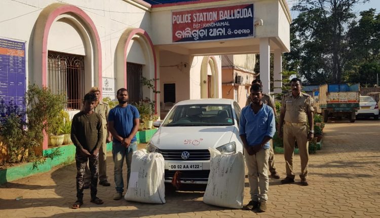ବାଲିଗୁଡ଼ା,୨/୩: ବେଆଇନ୍ ଗଞ୍ଜେଇ ଚୋରାଚାଲାଣ ବେଳେ ବାରଖମା-ବାଲିଗୁଡ଼ା ରାସ୍ତା ଅପରାନାଳ ନିକଟରେ ପୋଲିସ୍ ପକ୍ଷରୁ ଚଢ଼ାଉ ହୋଇଥିଲା । କାର୍ ସହ ୪୧କେଜି ୩୦୦ଗ୍ରାମ୍ ଗଞ୍ଜେଇ ଜବତକରିବାସହ ତିନିଜଣ ଚାଲାଣକାରୀଙ୍କୁ ଗିରଫକରି କୋର୍ଟ ଚାଲାଣ କରିଛି ପୋଲିସ୍ । ବାଲିଗୁଡ଼ା ଅଞ୍ଚଳରୁ କଟକ ଜିଲ୍ଲାକୁ ଚାଲାଣ ହେଉଥିବାବେଳେ ଜବତ ଗଞ୍ଜେଇର ଆନୁମାନିକ ମୂଲ୍ୟ ଦୁଇ ଲକ୍ଷ ଟଙ୍କାରୁ ଉର୍ଦ୍ଧ୍ୱ ହେବ ବୋଲି ସୂଚନା ମିଳିଛି । ସୂଚନା ପ୍ରକାରେ ବାଲିଗୁଡ଼ା ପୋଲିସ ପକ୍ଷରୁ ରାତ୍ରୀକାଳୀନ ପେଟ୍ରୋଲିଂ ଚାଲିଥିବା ସମୟରେ ବାଲିଗୁଡ଼ା-ବାରଖମା ୪୧ ନଂ ରାଜ୍ୟ ରାଜପଥ ଅପରାଧ ନାଳ ନିକଟରେ ଗଞ୍ଜେଇ ଭର୍ତ୍ତିର୍ି ଏକ କାର୍ ଜବତ କରିବାସହ ଡ୍ରାଇଭର ସମେତ ତିନିଜଣ ଚାଲାଣକାରୀଙ୍କୁ ଗିରଫ କରିଛି ପୋଲିସ୍ । ଗିରଫ ତିନିଜଣ କଟକ ଜିଲ୍ଲା ଆଠଗଡ଼ ଅଞ୍ଚଳର କଳିଙ୍ଗ କେଶରୀ ପ୍ରଧାନ, ବନମାଳୀ ମହାରଣା ଓ ସୈାଭାଗ୍ୟ ବେହେରା ହୋଇଥିବା ପୋଲିସ୍ ପକ୍ଷରୁ ସୂଚନା ମିଳିଛି ।