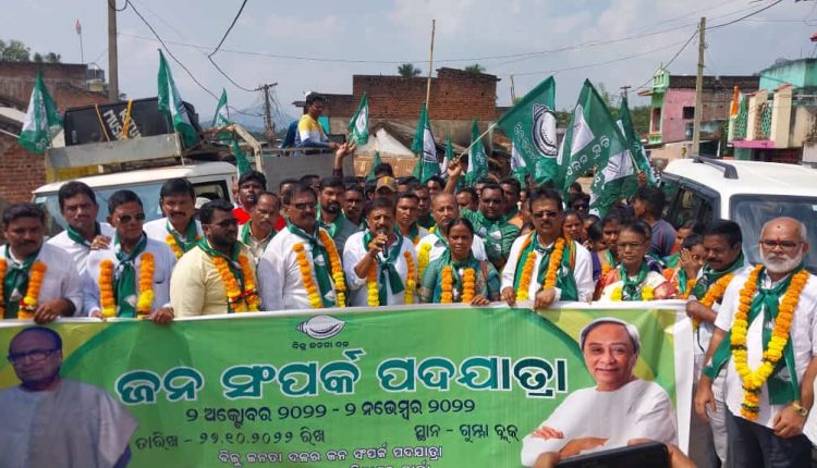 ପାରଳାଖେମୁଣ୍ଡି : ଗଜପତି ଜିଲ୍ଲା ଗୁମ୍ମା ବ୍ଳକରେ ବିଜେଡିର ଜନ ସମ୍ପର୍କ ପଦଯାତ୍ରା ଗଜପତି ଜିଲ୍ଲା ବିଜେଡି ସଭାପତି ପ୍ରଦୀପ ନାୟକଙ୍କ ନେତୃତ୍ୱରେ ଅନୁଷ୍ଠିତ ହୋଇଯାଇଛି । ଗୁମ୍ମା ବ୍ଳକର ବିଭିନ୍ନ ଅଞ୍ଚଳ ବୁଲି ମାନ୍ୟବର ମୁଖ୍ୟମନ୍ତ୍ରୀଙ୍କ ବିଭିନ୍ନ ଜନ ହିତକର ଯୋଜନା ଗୁଡିକ କିପରି ତୃଣମୂଳ ସ୍ତରରେ ପ୍ରକୃତ ହିତାଧିକାରୀଙ୍କ ନିକଟରେ ପହଞ୍ଚି ପାରିବ ଓ ଜିଲ୍ଲାର ବିକାଶ ଧାରାକୁ ତ୍ୱରାନ୍ୱିତ ହୋଇପାରିବ । ସରକାରଙ୍କ ଲୋକାଭିମୁଖୀ ଯୋଜନାର ସଫଳ ରୂପାୟନ କରି ସରକାରଙ୍କ ଯୋଜନାରେ ପ୍ରକୃତ ହିତାଧିକାରୀ ସାମିଲ ହୋଇପାରିବେ । ଜନ ସାଧାରଣ ସଚେତନତା ହେବା ସହ ଜିଲ୍ଲାର ବିକାଶର ଅଗ୍ରଗତି ହୋଇପାରିବ ତ ଆଶା କରାଯାଉଛି । ଏହି ପଦଯାତ୍ରାରେ ବିଜେଡି ଯୁବ ସଭାପତି ଏସ ଲିଙ୍ଗରାଜ, ଲକ୍ଷ୍ମୀ କାନ୍ତ ପରିଚ୍ଛା, ଯାମାଦାର ପଟ୍ଟନାୟକ, ପ୍ରଣୋଜ ପଟ୍ଟନାୟକ, ହାଇ ଟେକ ଗ୍ରୁପର ଅଧ୍ୟକ୍ଷ ଡକ୍ଟର ତିରୁପତି ପାଣିଗ୍ରାହୀ, ଜିଲ୍ଲା ପରିଷଦ ଅଧ୍ୟକ୍ଷ ଜୀ ତିରୁପତି ରାଓ, ଗୁମ୍ମା ବ୍ଳକ ଅଧ୍ୟକ୍ଷା ସୁନେମି ମଣ୍ଡଳ, ବରିଷ୍ଠ ବିଜେଡି ନେତା ବସନ୍ତ ଦାସ ପ୍ରମୁଖ ବହୁ ନେତା ଓ କର୍ମୀ ଯୋଗ ଦେଇଥିଲେ ।