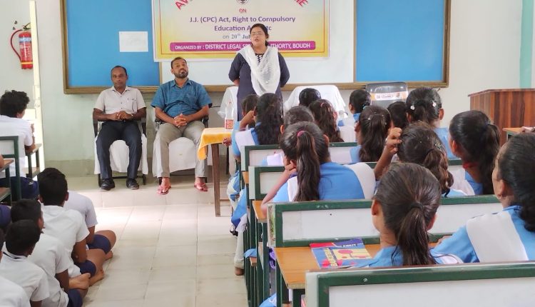 ବୌଦ୍ଧ,୨୦/୭:- ବୌଦ୍ଧଜିଲ୍ଲା ଆଇନସେବା ପ୍ରାଧିକରଣ ତରଫରୁ ବାବା ବୈଦ୍ୟନାଥ ଉଚ୍ଚ ମାଧ୍ୟମିକ ବିଦ୍ୟାଳୟ ସରସରା ଠାରେ ନାବାଳକଙ୍କ ପାଇଁ ନ୍ୟାୟ, ଯତ୍ନ ଓ ସୁରକ୍ଷା ଅଧିନିୟମ ଏବଂ ସରକାରଙ୍କ ଦ୍ୱାରା ୬ ରୁ ୧୪ ବର୍ଷ ବୟସ ଶିଶୁମାନଙ୍କ ପାଇଁ ହୋଇଥିବା ବାଧ୍ୟତାମୂଳକ ଶିକ୍ଷା ଦେବାର ବ୍ୟବସ୍ଥା ଉପରେ ଏକ ଆଇନ ସଚେତନତା କାର୍ଯ୍ୟକ୍ରମ ଅନୁଷ୍ଠିତ ହୋଇଯାଇଛି । ଜିଲ୍ଲା ଆଇନସେବା ପ୍ରାଧିକରଣ ବୌଦ୍ଧର ସଚିବ ଶ୍ରୀମତୀ ଶାଶ୍ୱତୀ ମିଶ୍ରଙ୍କ ଅଧ୍ୟକ୍ଷତାରେ ଅନୁଷ୍ଠିତ ଏହି କାର୍ଯ୍ୟକ୍ରମରେ ଶିଶୁ କଲ୍ୟାଣ କମିଟିର ସଦସ୍ୟ ରାଜୀବ ନାୟକ, ଆଡଭୋକେଟ ବିକାଶ ଚନ୍ଦ୍ର ବେହେରା ଏବଂ ବାବା ବୈଦ୍ୟନାଥ ହାଇସ୍କୁଲର ପ୍ରଧାନଶିକ୍ଷକ ନିତ୍ୟାନନ୍ଦ ପ୍ରଧାନ ଉପସ୍ଥିତ ଥିଲେ । ଏହି କାର୍ଯ୍ୟକ୍ରମରେ ଛାତ୍ରୀଙ୍କୁ ଯୈ÷ାନ ଅପରାଧରୁ ସୁରକ୍ଷା ଆଇନ ଅନୁଯାୟୀ ଦୋଷୀକୁ ଦଣ୍ଡ, ସରକାରଙ୍କ ପକ୍ଷରୁ ପୀଡିତାଙ୍କ ପାଇଁ କ୍ଷତିପୂରଣର ବ୍ୟବସ୍ଥା, ଯୈ÷ାନ ନିର୍ଯ୍ୟାତନାରୁ କେମିତି ରକ୍ଷା କରିବାସହ ଶିକ୍ଷକ ଶିକ୍ଷୟତ୍ରୀଙ୍କ ଅଥବା ନିଜେ ଉପରୋକ୍ତ ଅଧିକାରୀଙ୍କୁ ଜଣାଇବା ଇତ୍ୟାଦି ଉପରେ ଆଲୋକପାତ କରିଥିଲେ । ଏହାବ୍ୟତୀତ ସରକାରଙ୍କ ଦ୍ୱାରା ଯେଉଁ ୬ ରୁ ୧୪ ବର୍ଷ ବୟସ ଶିଶୁମାନଙ୍କ ପାଇଁ ବାଧ୍ୟତାମୂଳକ ଶିକ୍ଷା ଦେବାର ବ୍ୟବସ୍ଥା ଅଛି ସେଉପରେ ମଧ୍ୟ ବିସ୍ତୃତ ଭାବେ ବୁଝାଯାଇଥିଲା ।