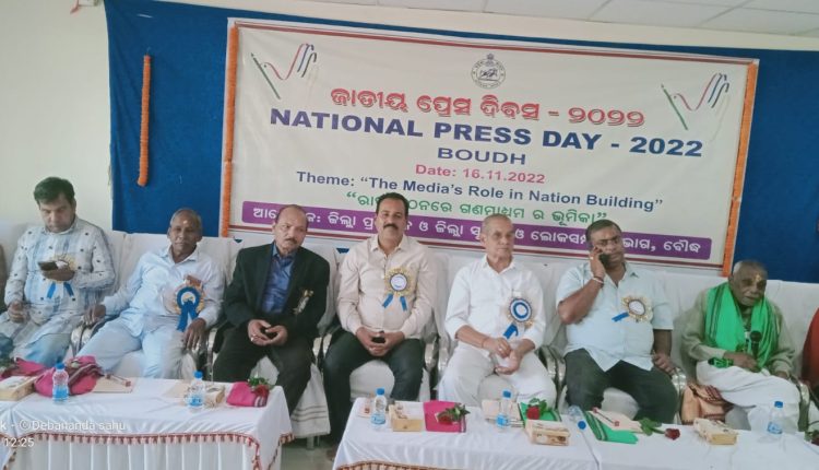 ବୌଦ୍ଧ,୧୬/୧୧ – ଜିଲ୍ଳା ସୂଚନା ଓ ଲୋକସଂପର୍କ ଅଧିକାରୀଙ୍କ କାର୍ଯ୍ୟାଳୟ ଠାରେ ଜାତୀୟ ପ୍ରେସ ଦିବସ ପାଳିତ ହୋଇଯାଇଛି । ଆଜିର ଏହି କାର୍ଯ୍ୟକ୍ରମରେ ଅତିଥିଭାବେ ବରିଷ୍ଠ ସାମ୍ବାଦିକ ବନମାଳୀ ପାଣିଗ୍ରାହୀ, ରଜନୀକାନ୍ତ ଦାଶ, ରବିନ୍ଦ୍ର ରାଉତ, ଦେବାଶିଷ ପୁରୋହିତ, ବୌଦ୍ଧ ବିଜ୍ଞାପିତ ଅଞ୍ଚଳ ପରିଷଦ ଅଧ୍ୟକ୍ଷ ମୃତ୍ୟୁଞ୍ଜୟ ମିଶ୍ର, ବୌଦ୍ଧ ବ୍ଲକ ଅଧ୍ୟକ୍ଷ ପ୍ରିୟଦର୍ଶୀ ପ୍ରତ୍ୟୁଷ ରଥ, ବୌଦ୍ଧ ପଞ୍ଚାୟତ ମହାବିଦ୍ୟାଳୟ ଅଧ୍ୟକ୍ଷ ପ୍ରକାଶ ଚନ୍ଦ୍ର ବେହେରା, ସାହିତ୍ୟିକ ରମେଶ ମେହେର, ନୀଳଲୋହିତ ମହାପାତ୍ର ପ୍ରମୁଖ ଯୋଗଦେଇଥିଲେ । ଅତିଥିମାନେ ପ୍ରଭୁ ଶ୍ରୀଜଗନ୍ନାଥଙ୍କ ନିକଟରେ ପୁଷ୍ପମାଲ୍ୟ ଅର୍ପଣ ଓ ପ୍ରଦୀପ ପ୍ରଜ୍ଜ୍ୱଳନ କରିବାପରେ ସଭାକାର୍ଯ୍ୟ ଆରମ୍ଭ ହୋଇଥିଲା । ଜିଲ୍ଲା ସୂଚନା ଓ ଲୋକସଂପର୍କ ଅଧିକାରୀ ରୀତାକାନ୍ତି ବଳିୟାରସିଂହ ଅତିଥି ପରିଚୟ ପ୍ରଦାନ କରିବାସହିତ ସଭା ପରିଚାଳନା କରିଥିଲେ । ଆଜିର ବିଷୟବସ୍ତୁ ‘ରାଷ୍ଟ୍ର ଗଠନରେ ଗଣମାଧ୍ୟମର ଭୁମିକା’ ଶୀର୍ଷକ ଉପରେ ଅତିଥିମାନେ ନିଜ ନିଜ ବକ୍ତବ୍ୟ ରଖିଥିଲେ । ସାମ୍ବାଦିକମାନେ ସତ୍ୟ, ତଥ୍ୟଭିତ୍ତିକ ଓ ଗଠନମୂଳକ ଖବର ପରିବେଷଣ କରିବାକୁ ଅତିଥିମାନେ ଆହ୍ୱାନ ଦେଇଥିଲେ । ଖବର ସଂଗ୍ରହ ସମୟରେ ସାମ୍ବାଦିକମାନଙ୍କୁ ବହୁ ବାଧାବିଘ୍ନର ମଧ୍ୟ ସମ୍ମୁଖୀନ ହେବାକୁ ପଡିଥାଏ । ତେଣୁ ପ୍ରଶାସନ ଓ ରାଜ୍ୟସରକାରଙ୍କ ତରଫରୁ ସାମ୍ବାଦିକମାନଙ୍କ ସୁରକ୍ଷା ପ୍ରତି ଧ୍ୟାନ ଦେଲେ ସାମ୍ବାଦିକତା ବୃତ୍ତି ପ୍ରତି ଆଗ୍ରହ ସୃଷ୍ଟି ହେବ ।