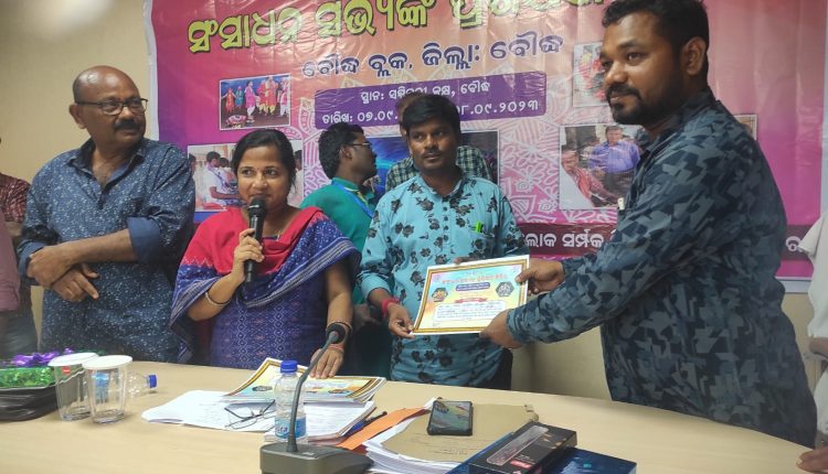 ବୌଦ୍ଧ,୮/୯:- ଜିଲ୍ଲା ସୂଚନା ଓ ଲୋକସଂପର୍କ ବିଭାଗ ଓ ଜିଲ୍ଲା ସଂସ୍କୃତି ବିଭାଗର ମିଳିତ ଆନୁକୂଲ୍ୟରେ ବ୍ଲକ ସମ୍ମିଳନୀ କକ୍ଷରେ ବୌଦ୍ଧ ବ୍ଲକସ୍ତରୀୟ ସଂସାଧନ ସଭ୍ୟଙ୍କ ଦୁଇଦିନିଆ ପ୍ରଶିକ୍ଷଣ ଶିବିର ଆଜି ଉଦଯାପିତ ହୋଇଯାଇଛି । କାର୍ଯ୍ୟକ୍ରମରେ ସମ୍ମାନିତ ଅତିଥି ଭାବେ ବ୍ଲକ ସାମାଜିକ ସୁରକ୍ଷା ଅଧିକାରୀ ଅଶ୍ୱିନୀ କୁମାର ପାଣ୍ଡେ ପ୍ରଶିକ୍ଷଣ ଶିବିରର ଉଦ୍ଦେଶ୍ୟ ଜ୍ଞାପନ, କଳା, ସାହିତ୍ୟ, ସଂସ୍କୃତି ଓ ପରମ୍ପରା କ୍ଷେତ୍ରରେ ବୌଦ୍ଧର ବିକାଶ, ସରକାରଙ୍କ ବିଭିନ୍ନ ଯୋଜନା ସମ୍ପର୍କିତ ବାର୍ତ୍ତା ଲୋକକଳା ମାଧ୍ୟମରେ ସମସ୍ତ ଗ୍ରାମରେ ପହଞ୍ଚାଇବା ପାଇଁ କଳାକାରମାନଙ୍କୁ ଆହ୍ୱାନ କରିଥିଲେ । ଜିଲ୍ଲା ସୂଚନା ଓ ଲୋକସମ୍ପର୍କ ଅଧିକାରୀ ରିତାକାନ୍ତି ବଳିୟାର ସିଂହ ପୂର୍ବଦିନର କାର୍ଯ୍ୟକ୍ରମର ସମୀକ୍ଷା, ଶିବିରର ଲକ୍ଷ୍ୟ ଓ ଉଦ୍ଦେଶ୍ୟ ଉପରେ ଆଲୋଚନା କରିବା ସହ ଆସନ୍ତା ସେପ୍ଟେମ୍ବର ୧୫ ରୁ ୩୦ ରିଖ ମଧ୍ୟରେ ପାଲା, ଦାସକାଠିଆ, ଘୋଡା ନାଚ, ଫୋକ ସଂଗୀତ ଓ ନୃତ୍ୟ ମାଧ୍ୟମରେ ପ୍ରତ୍ୟେକ ଗ୍ରାମରେ ସରକାରଙ୍କ ବିଭିନ୍ନ ଯୋଜନାର ସଫଳ ବାର୍ତ୍ତା ଲୋକମାନଙ୍କ ନିକଟରେ ପହଞ୍ଚାଇବା ପାଇଁ ତଥା ସୂଚନା, ଶିକ୍ଷା ଏବଂ ଯୋଗାଯୋଗ ଉପକ୍ରମରେ ଆୟୋଜିତ ଜିଲ୍ଲା ବ୍ୟାପୀ ସାଂସ୍କୃତିକ କାର୍ଯ୍ୟକ୍ରମ ସମ୍ପର୍କରେ କଳାକାରମାନଙ୍କର ଗୁରୁତ୍ୱପୂର୍ଣ୍ଣ ଭୁମିକା ରହିବ ଏବଂ ସମସ୍ତ କଳାକାରଙ୍କୁ ସୁଯୋଗ ଦିଆଯିବ ବୋଲି ମତବ୍ୟକ୍ତ କରିବାସହ ଏହି କାର୍ଯ୍ୟକ୍ରମର ମାର୍ଗଦର୍ଶିକା ବିଷୟରେ ଆଲୋକପାତ କରିଥିଲେ । ସଂସାଧନ କର୍ମୀ ଭାବେ ଜିଲ୍ଲା କଳା ସଂସ୍କୃତି ସଂଘର ଉପସଭାପତି ଦିବ୍ୟଶଙ୍କର ରାଉତ ଲୋକକଳା ପରିବେଷଣରେ ନାଟକୀୟତାର ଗୁରୁତ୍ୱ ପ୍ରମୁଖ ଆଠଗୋଟି ଯୋଜନାର ରୂପରେଖ, ସୂଚନା, ଶିକ୍ଷା ଓ ସଂଚାର ଅଭିଯାନକୁ ସଫଳ କରିବାପାଇଁ ବିଭିନ୍ନ ପଦକ୍ଷେପ ବିଷୟରେ ପୁଙ୍ଖାନୁପୁଙ୍ଖ ଆଲୋଚନା କରିବାସହ ଆଲୋଚନାର ସାରାଂଶ, ଚୂଡାନ୍ତୀକରଣ ଓ ପ୍ରଶ୍ନୋତ୍ତର ରଖିଥିଲେ । ଏହି କାର୍ଯ୍ୟକ୍ରମରେ ବରିଷ୍ଠ କଳାକାର, ସାହିତ୍ୟିକ, ନାଟ୍ୟକାର, ଗଣମାଧ୍ୟମପ୍ରତିନିଧି ଯୋଗ ଦେଇ ଆଲୋଚନାରେ ସକ୍ରିୟ ଅଂଶଗ୍ରହଣ କରିଥିଲେ । ରଘୁନାଥ କୀର୍ତ୍ତନ୍ୟ ମଣ୍ଡଳୀ, ଗୌଡି ସମ୍ପ୍ରଦା ଦଳ ଓ ସାଥି, ଗୋବିନ୍ଦପୁର ସଂକୀର୍ତ୍ତନ୍ୟ ପରିବେଷଣ , ବସନ୍ତ ରାଜହଂସ ପୁରମୁଣ୍ଡା ଖାଲିଆପାଲି ଏବଂ ରଘୁନାଥ ମେହେର, ବାଉଁଶୁଣୀ, ଜଗତ ରାମ ଜଗଦଲା, ଗୁଡ଼ପଡା ବାଉଁଶୁଣୀ, କୃଷ୍ଣଚନ୍ଦ୍ର ମିଶ୍ର ସରକାରଙ୍କ ବିଭିନ୍ନ ଯୋଜନା ଉପରେ ସଂଗୀତ ଓ ଭଜନ ପରିବେଷଣ କରିଥିଲେ । ଅନୁଜା ବେହେରା, ବାଉଁଶୁଣି, ଅଭାଗିନୀ ବେହେରା, ଜଗତି ଏବଂ ସାଥି କୃଷ୍ଣଗୁରୁ ପରିବେଷଣ କରିଥିଲେ । ଗଣେଶ୍ୱର ନାଗ ଓ ସାଥି, ପୂର୍ଣ୍ଣମାସି ପାଲା ଦଳ ବ୍ରାହ୍ମଣି ପାଲା ପରିବେଷଣ କରିଥିଲେ । କାର୍ଯ୍ୟକ୍ରମରେ ରଞ୍ଜିତ ମହାନ୍ତି, ସାନନ୍ଦ ସାହୁ, ବ୍ଲକ ସଂସାଧାନ ସଭ୍ୟ ରଞ୍ଜନ ପାତ୍ର, କରୁଣାକର ବଗର୍ତ୍ତୀ, ସୌମିତ୍ରୀ ମାଟିଆ, ମାଧବ ରଣା, ଅଜିତ କୁମାର ସାହୁ, ରମାକାନ୍ତ ପ୍ରଧାନ ଘାସିରାମ ଝାଙ୍କର, ମନୋରଞ୍ଜନ ସାହୁ, ଜଗଦିଶ ପ୍ରଧାନ ଏବଂ ଜିତେନ୍ଦ୍ର କୁମାର ମହାନ୍ତି ସହଯୋଗ କରିଥିଲେ । କାର୍ଯ୍ୟକ୍ରମ ଶେଷରେ କଳାକାର ମାନଙ୍କୁ ସାର୍ଟିଫିକେଟ ପ୍ରଦାନ କରାଯାଇଥିଲା । ଶେଷରେ ଡିଆଇପିଆରଓ ସୁଶ୍ରୀ ବଳିୟାର ସିଂହ ଧନ୍ୟବାଦ ଅର୍ପଣ କରିଥିଲେ ।