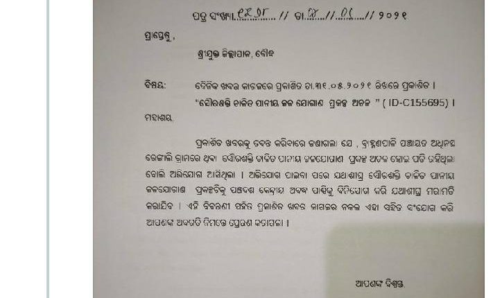 ସେ ସମ୍ପର୍କରେ ବୌଦ୍ଧ ଜିଲ୍ଲାପାଳଙ୍କ ନିକଟକୁ ଚିଠି ଆସିବା ପରେ ବୌଦ୍ଧ ବ୍ଲକ୍ ବିଡିଓଙ୍କୁ କାର୍ଯ୍ୟାନୁଷ୍ଠାନ ପାଇଁ ନିର୍ଦ୍ଦେଶ ଦେଇଥିଲେ । ଏ ପ୍ରକଳ୍ପକୁ ଯଥା ଶୀଘ୍ର ମରାମତି ପାଇଁ ପଦକ୍ଷେପ ନିଆଯାଉଥିବା ବିଡିଓ ଜିଲ୍ଲାପାଳ ନିକଟକୁ ଗତ ୪ ତାରିଖରେ ପତ୍ର ମାଧ୍ୟମରେ ଜଣାଇଛନ୍ତି ।