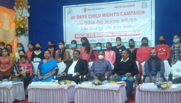 ହି କାର୍ଯ୍ୟକ୍ରମରେ ସମ୍ମାନିତ ଅତିଥିିଭାବେ ବୌଦ୍ଧ ଅତିରିକ୍ତ ଜିଲ୍ଲା ଆରକ୍ଷୀ ଅଧିକ୍ଷକ ରବିନ୍ଦ୍ର କୁମାର ରାଉତ ବାଲ୍ୟବିବାହ, ଶିଶୁଶ୍ରମିକ ଓ ଅନ୍ୟାନ୍ୟ ଶିଶୁସୁରକ୍ଷା ପ୍ରସଙ୍ଗରେ ପୋଲିସର ଭୂମିକା ଗୁରୁତ୍ୱପୂର୍ଣ୍ଣ ବୋଲି କହିଥିଲେ । ଅନ୍ୟତମ ସମ୍ମାନିତ ଅତିଥିି ଭାବେ ଶିଶୁ ମଙ୍ଗଳ ସମିତି ଅଧ୍ୟକ୍ଷ ସାକ୍ଷୀଗୋପାଳ ପ୍ରଧାନ ଯୋଗଦେଇ ବାଲ୍ୟ ବିବାହକୁ ରୋକିବା ପାଇଁ ହେଲେ ବ୍ୟାପକ ସଚେତନତା କରିବା ସହିତ ଏହାର ଶିକାର ଶିଶୁଙ୍କୁ ଜୀବନ କୌଶଳ ଶିକ୍ଷାରେ ସାମିଲ କରିବା ପାଇଁ କହିଥିଲେ । ଜିଲ୍ଲା ସମାଜ ମଙ୍ଗଳ ଅଧିକାରୀ ଲକ୍ଷପତି ଭୋଇ ସଭାପତିତ୍ୱ କରିଥିବାବେଳେ ଜିଲା ସୂଚନା ଓ ଲୋକସମ୍ପର୍କ ଅଧିକାରୀ ରୀତାକାନ୍ତି ବଳିୟାର ସିଂ ବାଲ୍ୟବିବାହ ସଚେତନତା କାର୍ଯ୍ୟକ୍ରମର ସଂଯୋଜିକା ପ୍ରବିଜ୍ଞା ଦାଶ, କଂଟାମାଳ ସି.ଡି.ପି.ଓ, ମହିଳା ପରିଦର୍ଶିକା, ଅଙ୍ଗନୱାଡି କର୍ମୀ ଏବଂ ସ୍ୱେଚ୍ଛାସେବୀ ଅନୁଷ୍ଠାନ ସେଭ ଦ ଚିଲ୍ଡରେନ ସହଯୋଗ କରିଥିବାବେଳେ ୱାଇ.ସି.ଡିଏ, ଚାଇଲ୍ଡ ଲାଇନ କର୍ମଚାରୀ ଉପସ୍ଥିତ ଥିଲେ । ଜିଲା ଶିଶୁ ସୁରକ୍ଷା ୟୁନିଟ୍‌ର ସୁରକ୍ଷା ଅଧିକାରୀ ରାଜେନ୍ଦ୍ର ମଲ୍ଲିକ ,ସମରସେନ ସିଂହ,ସହଦେବ ନାଏକ, ବସନ୍ତ ଦିଶିରି, ଧନଞ୍ଜୟ ଖମାରୀ, ଚିତ୍ରସେନ ସାହୁ ପ୍ରମୁଖ କାର୍ଯ୍ୟକ୍ରମ ପରିଚାଳନାରେ ସହଯୋଗ କରିଥିବାବେଳେ ସୁଶାନ୍ତ ଭୋଇ ଧନ୍ୟବାଦ ଅର୍ପଣ କରିଥିଲେ । ଶିଶୁଟିଏ କୌଣସି ପରିସ୍ଥିତିରେ ଅସୁରକ୍ଷିତ ମଣିଲେ ଓ ଅସୁବିଧାରେ ଦେଖିଲେ ତୁରନ୍ତ ବିଭାଗୀୟ ଅଧିକାରୀଙ୍କୁ ତଥା ଲୋକାଲ ପୋଲିସ୍‌, ଚାଇଲ୍ଡଲାଇନ-୧୦୯୮ କିମ୍ବା ଶିଶୁ ସୁରକ୍ଷା ୟୁନିଟ୍‌କୁ ତୁରନ୍ତ ସୁଚନା ଦେବାପାଇଁ କାର୍ଯ୍ୟକ୍ରମରେ ମତପ୍ରକାଶ ପାଇଥିଲା । ରାଜ୍ୟ ଶିଶୁସୁରକ୍ଷା ଆୟୋଗଙ୍କ ଦ୍ୱାରା ୪୦ଦିନ ଧରି ରାଜ୍ୟବ୍ୟାପି ଭ୍ରାମ୍ୟମାଣ ସଚେତନତା ରଥ ପରିକ୍ରମା କରୁଥିବାବେଳେ ଆଜି ଏଠାରେ ଏହି ରଥକୁ ଭବ୍ୟସ୍ୱାଗତ କରାଯାଇଥିଲା । ଟାଉନ ହଲରୁ ରଥ ପରିକ୍ରମା ଆରମ୍ଭ ହୋଇ ଲକ୍ଷ୍ମୀପ୍ରସାଦ ଗ୍ରା.ପ, କସ୍ତୁରବା ଗାନ୍ଧୀ ବାଳିକା ବିଦ୍ୟାଳୟ ବଲାସିଙ୍ଗା, ଶିଶୁ ବିକାଶ ପ୍ରକଲ୍ପ ଅଧିକାରୀଣୀଙ୍କ କାର୍ଯ୍ୟାଳୟ , ରାମକୃଷ୍ଣ ବାଳାଶ୍ରମ ଓ ଆବାସିକ ବିଦ୍ୟାଳୟ ଝାଡ୍ରାଜିଙ୍ଗ ପରିଭ୍ରମଣ କରିଥିବାବେଳେ ଛାତ୍ରଛାତ୍ରୀ, ଅଙ୍ଗନୱାଡି କର୍ମୀମାନେ ସ୍ୱାଗତ କରିଥିଲେ ।