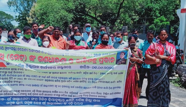 ବୌଦ୍ଧ,୧/୯- ଗାଁ ସାଥୀ (ମେଟ୍‌) ସଙ୍ଘ ମିଳିତ କ୍ରିୟାନୁଷ୍ଠାନ କମିଟି ବୌଦ୍ଧ ଶାଖା ତରଫରୁ ଆଜି ୫ଟି ଦାବି ନେଇ ସ୍ଥାନୀୟ ସର୍କିଟ ହାଉସନିକଟରୁ ଶତାଧିକ ଗାଁ ସାଥୀ ଏକ ଶୋଭାଯାତ୍ରାରେ ବାହାରି ଜିଲ୍ଲାପାଳଙ୍କ କାର୍ଯ୍ୟାଳୟ ସମ୍ମୁଖରେ ନାରାବାଜି କରିଥିଲେ । ଦାବିଗୁଡିକ ମଧ୍ୟରେ ରାଜ୍ୟରେ ମନରେଗାରେ କାର୍ଯ୍ୟରତ ସମସ୍ତ ନ୍ୟାୟ, ଗ୍ରାମୀଣ ସ୍ତରରେ ପର୍ଯ୍ୟାପ୍ତ କାର୍ଯ୍ୟସହିତ ସର୍ବନିମ୍ନ ୮ହଜାର ଟଙ୍କାରୁ ଉର୍ଦ୍ଧ୍ୱ ମାସିକ ପ୍ରୋତ୍ସାହନ ରାଶି ପ୍ରଦାନର ବ୍ୟବସ୍ଥା, ମନରେଗାରେ ୧୩ ବର୍ଷଧରି କାର୍ଯ୍ୟରତ ଗାଁ ସାଥୀଙ୍କ ପାଇଁ କ୍ଷତିକାରକ ହୋଇଥିବା ୩ଟି ସରକାରୀ ଚିଠିକୁ ତୁରନ୍ତ ପ୍ରତ୍ୟାହାର, ପଞ୍ଚାୟତିରାଜ ବିଭାଗର ଚିଠି ଅନୁସାରେ ଉଚିତ ପ୍ରାପ୍ୟ ସହିତ ମାସିକ ୧୦ ଦିନର ଗ୍ୟାରେଣ୍ଟେଡ କାର୍ଯ୍ୟ ଉଚିତ ପ୍ରାପ୍ୟ ସହିତ ପ୍ରଦାନର ସଠିକ ପ୍ରଶାସନିକ ବ୍ୟବସ୍ଥା, କୋଭିଡ ମହାମାରୀ ସମୟରେ ରାଜ୍ୟର ସମସ୍ତ ନ୍ୟାୟ ଆଶାୟୀ ଗାଁ ସାଥୀଙ୍କୁ ୨୦ ହଜାରରୁ ଉର୍ଦ୍ଧ୍ୱ କୋଭିଡ ସହାୟତା ରାଶି ପ୍ରଦାନ, ଜବକାର୍ଡଧାରୀ ପରିବାରଙ୍କୁ କୋରନାର ଏହି ବିପଦ ସମୟରେ ବାର୍ଷିକ ୧୦୦ ଦିନ ପରିବର୍ତ୍ତେ ମନରେଗାର ୨୦୦ ଦିନର ନିଶ୍ଚିତ କର୍ମଯୋଗାଣ ଓ ଦୈନିକ ମଜୁରୀ ୨୧୫ ଟଙ୍କା ପରିବର୍ତ୍ତେ ୩୦୦ ଟଙ୍କାରୁ ଉର୍ଦ୍ଧ୍ୱ ପ୍ରଦାନ ଲାଗି ସରକାରୀ ବ୍ୟବସ୍ଥା କରିବା ପ୍ରମୁଖ ରହିଛି ।