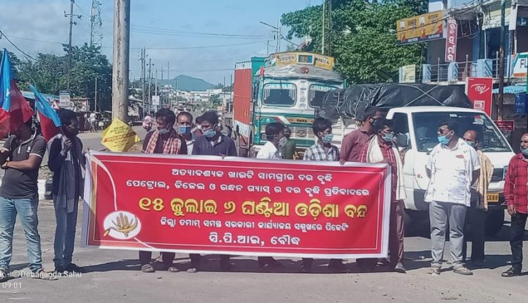 ବୌଦ୍ଧ,୧୫/୭- ପେଟ୍ରୋଲ, ଡିଜେଲ ଓ ରନ୍ଧନ ଗ୍ୟାସର ଅହେତୁକ ଦରବୃଦ୍ଧି ତଥା ଖାଉଟି ସାମଗ୍ରୀର ଦରବୃଦ୍ଧି ପ୍ରତିବାଦରେ ଆଜି ସିପିଆଇ ଓ କଂଗ୍ରେସ ତରଫରୁ ସକାଳ ୬ ରୁ ଦିନ ୧୨ଟା ପର୍ଯ୍ୟନ୍ତ ୬ଘଣ୍ଟିଆ ବୌଦ୍ଧବନ୍ଦ ପାଳନ ହୋଇଯାଇଛି । ସିପିଆଇ ଦଳ ତରଫରୁ ସାଙ୍କେତିକ ଭାବେ ବନ୍ଦ ପାଳନ କରାଯାଇଥିବାବେଳେ କଂଗ୍ରେସ ଦଳ ମଧ୍ୟ ସମର୍ଥନ କରି ବନ୍ଦ ପାଳନ କରିଥିଲା । ଯାନବାହନ ଚଳାଚଳ, ପେଟ୍ରୋଲ ପଂପ୍ ୬ଘଣ୍ଟା ପାଇଁ ବନ୍ଦ ରହିଥିବା ବେଳେ ସମସ୍ତ ଦୋକାନ ବଜାର, କୋର୍ଟ, କଚେରୀ, ବ୍ୟାଙ୍କ, ସରକାରୀ ବେସରକାରୀ ଅଫିସ ସବୁ ଖୋଲାଥିବା ଦେଖିବାକୁ ମିଳିଥିଲା । ସିପିଆଇ ତରଫରୁ ସିପିଆଇ ନେତାଅବକାଶ ସାହୁଙ୍କ ନେତୃତ୍ୱରେ ଶତାଧିକ ସିପିଆଇ କର୍ମୀ ଏନଏସି ଛକଠାରେ ଯାନବାହନ ଅଟକାଉଥିବାବେଳେ କେନ୍ଦ୍ର ସରକାରଙ୍କ ବିରୁଦ୍ଧରେ ବିଭିନ୍ନ ନାରାବାଜି କରିଥିଲେ ।
