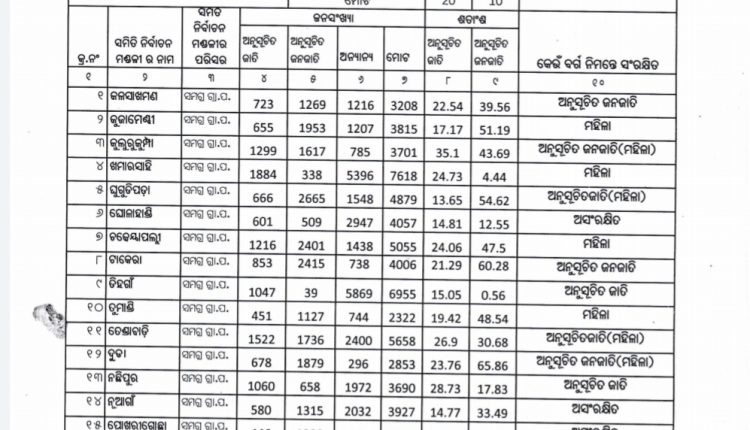 ଦଶପଲ୍ଲା,୯/୧୦ : – ନୟାଗଡ ଜିଲ୍ଲାରେ ତ୍ରିସ୍ତରୀୟ ପଞ୍ଚାୟତ ନିର୍ବାଚନ ପାଇଁ ଆଜି ସଂରକ୍ଷିତ ତାଲିକା ପ୍ରକାଶ ପାଇଛି । ନୟାଗଡ ଜିଲ୍ଲାପାଳ ଡ. ପୋମା ଟୁଡୁଙ୍କ ଅନୁମୋଦନକ୍ରମେ ଜିଲ୍ଲା ପଞ୍ଚାୟତ କାର୍ଯ୍ୟାଳୟ ପକ୍ଷରୁ ତାଲିକା ପ୍ରକାଶ କରାଯାଇଛି । ନୟାଗଡ ଜିଲ୍ଲାର ୨୪ଟି ଜିଲ୍ଲା ପରିଷଦ ଜୋନ୍, ୮ଟି ବ୍ଲକ ଅଧ୍ୟକ୍ଷପଦ ଏବଂ ୧୯୬ ସରପଞ୍ଚ , ସମିତି ସଭ୍ୟ ପଦବୀ ସହ ୱାର୍ଡ ସଭ୍ୟଙ୍କ ସଂରକ୍ଷିତ ଆସନ ତାଲିକା ପ୍ରକାଶ ପାଇଛି । ନୟାଗଡ ବ୍ଲକ ଅଧ୍ୟକ୍ଷ ପଦ ଅନୂସୂଚିତ ଜାତି ମହିଳା ଭାବେ ସଂରକ୍ଷିତ ହୋଇଥିବା ବେଳେ ଓଡଗାଁ ବ୍ଲକ ପଛୁଆବର୍ଗ, ଖଣ୍ଡପଡା ଅନୂସୂଚିତ ଜନଜାତି ମହିଳା, ଗଣିଆ ଅସଂରକ୍ଷିତ, ଦଶପଲ୍ଲା ପଛୁଆବର୍ଗ ମହିଳା, ନୂଆଗାଁ ମହିଳା, ଭାପୁର ଓ ରଣପୁର ବ୍ଲକ ଅସଂରକ୍ଷିତ ରହିଛି । ଜିଲ୍ଲାର ୮ଟି ବ୍ଲକରେ ୪ ଜଣ ମହିଳା ଅଧ୍ୟକ୍ଷ ପାଇଁ ଗୁରୁତ୍ୱ ଆସନ ସଂରକ୍ଷିତ କରାଯାଇଛି । ସେହିଭଳି ଭାବେ ଜିଲ୍ଲା ପରିଷଦ ସଭ୍ୟ ପାଇଁ ଓଡଗାଁ ୧ନଂ ଜୋନ୍ ମହିଳା, ଓଡଗାଁ ୨ନଂ ଜୋନ୍ ଅସଂରକ୍ଷିତ, ଓଡଗାଁ ୩ ନଂ ଜୋନ୍ ଅନୁସୂଚିତ ଜାତି ମହିଳା, ଓଡଗାଁ ୪ ନଂ ଜୋନ୍ ମହିଳା, ଖଣ୍ଡପଡା ୫ନଂ ଜୋନ ଅନୁସୂଚିତ ଜାତି, ଖଣ୍ଡପଡା ୬ ନଂ ଜୋନ୍ ମହିଳା, ଖଣ୍ଡପଡା ୭ନଂ ଜୋନ୍ ଅସଂରକ୍ଷିତ, ଗଣିଆ ୮ ନଂ ଜୋନ୍ ମହିଳା, ଦଶପଲ୍ଲା ୯ ନଂ ଜୋନ୍ ପଛୁଆବର୍ଗ, ଦଶପଲ୍ଲା ୧୦ ନଂ ଏବଂ ୧୧ ନଂ ଜୋନ୍ ପଛୁଆବର୍ଗ ମହିଳା, ନୟାଗଡ ୧୨ ନଂ ଏବଂ ୧୩ ନଂ ଜୋନ୍ ଅସଂରକ୍ଷିତ, ନୟାଗଡ ୧୪ ନଂ ଜୋନ ଅନୁସୂଚିତ ଜାତି, ନୟାଗଡ ୧୫ ନଂ ଜୋନ୍ ପଛୁଆବର୍ଗ, ନୂଆଗାଁ ୧୬ ନଂ ଜୋନ୍ ପଛୁଆବର୍ଗ ମହିଳା, ନୂଆଗାଁ ୧୭ ନଂ ଜୋନ୍ ଅନୂସୂଚିତ ଜନଜାତି ମହିଳା, ଭାପୁର ୧୮ ନଂ ଜୋନ ପଛୁଆବର୍ଗ, ଭାପୁର ୧୯ନଂ ଏବଂ ୨୦ ନଂ ଜୋନ ଅସଂରକ୍ଷିତ, ରଣପୁର ୨୧ ନଂ ଜୋନ୍ ମହିଳା, ରଣପୁର ୨୨ ନଂ ଜୋନ୍ ଅସଂରକ୍ଷିତ, ରଣପୁର ୨୩ ନଂ ଜୋନ୍ ଅନୂସୂଚିତ ଜାତି ମହିଳା, ରଣପୁର ୨୪ ନଂ ଜୋନ୍ ମହିଳା ପଦବୀ ପାଇଁ ସଂରକ୍ଷିତ କରାଯାଇଛି । ସେହିଭଳି ଭାବେ ସରପଞ୍ଚ ଏବଂ ସମିତି ସଭ୍ୟ ପଦବୀ ପାଇଁ ୫୦ ପ୍ରତିଶତ ମହିଳା ପଦବୀକୁ ଗୁରୁତ୍ୱ ଦିଆଯାଇଛି । ଏଥିପାଇଁ ମଧ୍ୟ ତାଲିକା ପ୍ରକାଶ ପାଇଛି ।