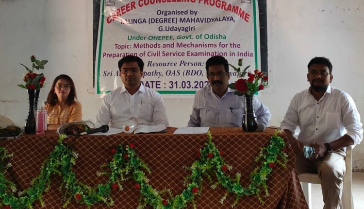 ଜି.ଉଦୟଗିରି,୩୧/୩- ସ୍ଥାନୀୟ କଳିଙ୍ଗ ମହାବିଦ୍ୟାଳୟ ପରିସରରେ ବିଶ୍ୱ ବ୍ୟାଙ୍କ ଓ ଉଚ୍ଚ଼ଶିକ୍ଷା ବିଭାଗ, ଓଡିଶା ସରକାରଙ୍କ ଦ୍ୱାରା ପ୍ରାୟୋଜିତ ଶିକ୍ଷା ଓ କର୍ମସଂସ୍ଥାନ ସଂପର୍କୀୟ ଏକ କର୍ମଶାଳା ଅଧ୍ୟକ୍ଷ ସୁଧାଂଶୁ ଶେଖର ମେହେରଙ୍କ ସଭାପତିତ୍ୱରେ ଅନୁଷ୍ଠିତ ହୋଇଥିଲା । ଏଥିରେ ମୁଖ୍ୟଅତିଥି ତଥା ସାଧନକର୍ମୀ ଭାବେ ଗୋଷ୍ଠୀ ଉନ୍ନୟନ ଅଧିକାରୀ ଆଶିଷ କୁମାର ତ୍ରିପାଠୀ ଯୋଗଦେଇ ପ୍ରଶାସନିକ ସେବା ଅଧିକାରୀ ପାଇଁ ପ୍ରସ୍ତୁତି ସଂପର୍କରେ ଛାତ୍ରଛାତ୍ରୀମାନଙ୍କୁ ବିଭିନ୍ନ ତଥ୍ୟ ପ୍ରଦାନ କରିବା ସହିତ ଆଗାମୀ ଦିନରେ ଛାତ୍ରଛାତ୍ରୀମାନଙ୍କୁ ଏ ସଂପର୍କରେ ସବିଶେଷ ଶିକ୍ଷାଦାନ ପାଇଁ ପ୍ରତିଶ୍ରୁତି ଦେଇଥିଲେ । ଅନ୍ୟତମ ଅତିଥି ଭାବରେ ଗୋଷ୍ଠୀ ସାମାଜିକ ସୁରକ୍ଷା ଅଧିକାରୀ ସଙ୍ଗୀତା ବେହେରା ଯୋଗ ଦେଇଥିଲେ । ଅଧ୍ୟାପିକା ସୁଭଦ୍ରା ସାହୁ ପ୍ରାକ୍‌ ସୂଚନା ଦେଇଥିବା ବେଳେ ଅଧ୍ୟାପକ ଡଃ ପ୍ରସନ୍ନ କୁମାର ଦାସ ଅତିଥିମାନଙ୍କ ପରିଚୟ ପ୍ରଦାନ କରିଥିଲେ । ଡଃ ରାଜେଶ ବାଗଙ୍କ ସଂଯୋଜନାରେ ଆୟୋଜିତ କାର୍ଯ୍ୟକ୍ରମରେ ଅଧ୍ୟାପକ ରୂପବନ୍ତ ଭୋଇ ଧନ୍ୟବାଦ ଅର୍ପଣ କରିଥିଲେ ।