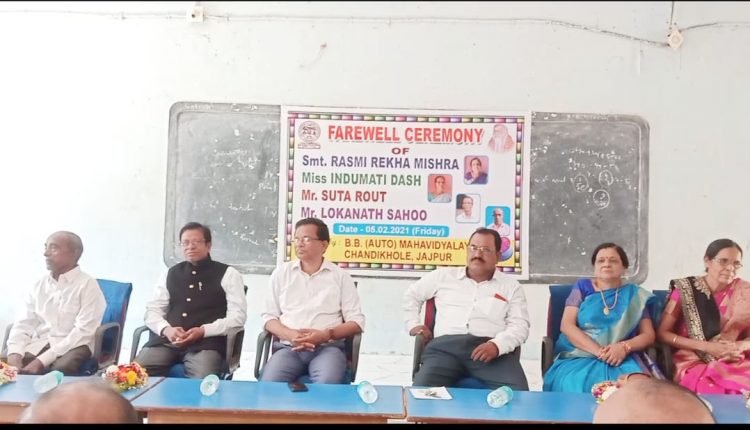ଚଣ୍ଡିଖୋଲ –ଚଣ୍ଡୀଖୋଲ ସ୍ଥିତ ବାବା ଭୈରବାନନ୍ଦ ସ୍ବୟଂଶାସିତ ମହାବିଦ୍ୟାଳୟରେ ଅବସର ନେଇଥିବା ଚାରିଜଣ କର୍ମଚାରୀଙ୍କ ପାଇଁ ବିଦ୍ୟକାଳୀନ ସମ୍ୱର୍ଦ୍ଧନା ସଭା ଅଧ୍ୟକ୍ଷ ଡ଼ ବିରେନ୍ଦ୍ର କୁମାର ମିଶ୍ରଙ୍କ ସଭାପତିତ୍ୱରେ ଆଜି ଅନୁଷ୍ଠିତ ହୋଇଯାଇଛି ।ଅବସର ନେଇଥିବା ବ୍ୟକ୍ତିତ୍ୱ ମଧ୍ୟରେ ଶିକ୍ଷା ଭିବାଗୀୟମୁଖ୍ୟ ପ୍ରାଧ୍ୟାପିକା ରଶ୍ମିରେଖା ମିଶ୍ର,ଅର୍ଥନୀତି ଭିବାଗୀୟମୁଖ୍ୟ ପ୍ରାଧ୍ୟାପିକା ଇନ୍ଦୁମତୀ ଦାସ,ମୁଖ୍ୟ କିରାଣୀ ସୁତ ରାଉତ,ଓ ପିଅନ ଲୋକନାଥ ସାହୁ । ଅନ୍ୟାନ୍ୟ ଅତିଥି ମାନଙ୍କ ମଧ୍ୟରେ ପୂର୍ବତନ ଅଧ୍ୟକ୍ଷ ସର୍ବଶ୍ରୀ ନରେନ୍ଦ୍ର କୁମାର ମିଶ୍ର,କେଦାରନାଥ ଦାସ,ବିନାୟକ ପଣ୍ଡା,ଉମେଶ କୁମାର ରାଉତ ପ୍ରମୁଖ ଅବସରକାଳୀନ ସମ୍ପକରେ ଆଲୋଚନା କରିଥିଲେ।ମହାବିଦ୍ୟାଳୟ ତରଫରୁ ପ୍ରାଧ୍ୟାପକ ତଥା ଷ୍ଟାଫ ଆସୋସିଏସନ ସମ୍ପାଦକ ଡ଼ ମନୋଜ ଦାସ,ଡନେଶ୍ୱର ମହାନ୍ତି,ରାଜେନ୍ଦ୍ର ପାଢ଼ୀ,ରାମ ଚନ୍ଦ୍ର ମହାନ୍ତି, ଡ଼ ସୁଜାତା ସେନାପତି,ସୁକ୍ରେସିନୀ ରାଉତ,ସଲୀଳ ମହାନ୍ତି,ବିଜୟ କେତନ ସାମଲ,ଚିନ୍ମୟୀ ରାଉତ ପ୍ରମୁଖ ଵ୍ୟକ୍ତବ୍ୟ ପ୍ରଦାନ କରି ଚାରିଜଣଙ୍କ ଅବଦାନ ସମ୍ପର୍କରେ ଆଲୋଚନା କରିଥିଲେ। ପରିଶେଷରେ ମହାବିଦ୍ୟାଳୟ ତରଫରୁ ଚାରିଜଣଙ୍କୁ ସମ୍ବଧିତ କରାଯାଇଥିଲା।ପରିଶେଷରେ ଡ଼ ଦିଲ୍ଲୀପ କୁମାର ନାୟକ ଧନ୍ୟବାଦ ଅର୍ପଣ କରିଥିଲେ ।