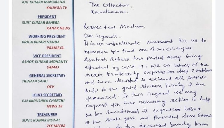 ଦିବଙ୍ଗତ କୋଭିଡ ଯୋଦ୍ଧା ସାମ୍ବାଦିକ ପରିବାରକୁ ଆର୍ଥିକ ସାହାଯ୍ୟ ପ୍ରଦାନ କରିବା ପାଇଁ ଫ୍ରଣ୍ଟଲାଇନ ମିଡ଼ିଆ ଏସୋସିଏସନ ପକ୍ଷରୁ ଜିଲ୍ଲାପାଳଙ୍କୁ ସ୍ମାରକପତ୍ର ପ୍ରଦାନ