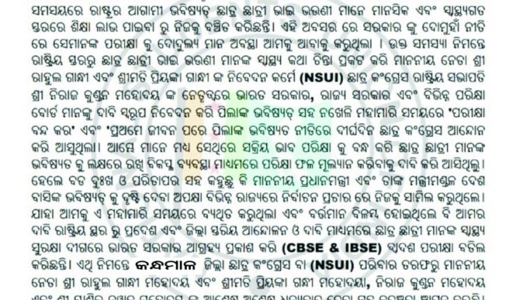 ସିବିଏସଇ ଦ୍ୱାଦଶ ବୋର୍ଡ଼ ପରୀକ୍ଷା ବାତିଲକୁ ଛାତ୍ର କଂଗ୍ରେସର ସମର୍ଥନ