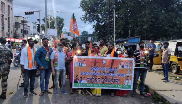 ଅହେୁତକ ବିଦ୍ୟୁତ୍ ଶୁଳ୍କ ବୃଦ୍ଧି ଓ ଲୋଭୋଲ୍ଟେଜକୁ ପ୍ରତିବାଦ କରି ରାୟଗଡ ଜିଲ୍ଳା ବିଜେପି ଯୁବମୋର୍ଚ୍ଚା ପକ୍ଷରୁ କ୍ୟାଣ୍ଡେଲ ଶୋଭାଯାତ୍ରା