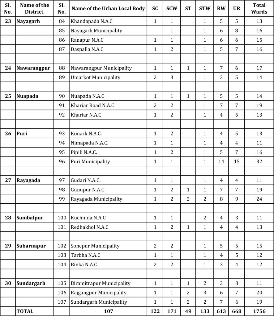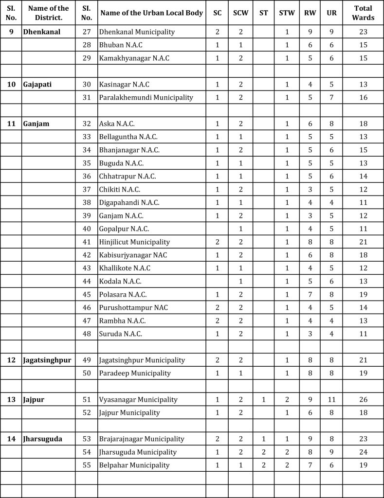 ରାଜ୍ୟର ୧୦୭ ଏନଏସି ଓ ମ୍ୟୁନିସିପାଳିଟି ପାଇଁ ୧୭୫୬ କାଉନସିଲର ପଦବୀ ରହିଛି । ତନ୍ମଧ୍ୟରୁ ଅନୁସୂଚିତ ଜାତି ପାଇଁ ୧୨୨, ଅନୁସୂଚିତ ଜାତି ମହିଳାଙ୍କ ପାଇଁ ୧୭୧, ଅନୁସୂଚିତ ଜନଜାତି ପାଇଁ ୪୯, ଅନୁସୂଚିତ ଜନଜାତି ମହିଳାଙ୍କ ପାଇଁ ୧୩୩, ମହିଳାଙ୍କ ପାଇଁ ୬୧୩ ଓ ଅଣସଂରକ୍ଷିତ ପାଇଁ ୬୬୮ ଟି ଆସନ ସଂରକ୍ଷଣ ନେଇ ପ୍ରକାଶ କରିଛନ୍ତି ରାଜ୍ୟ ନିର୍ବାଚନ କମିଶନ ।