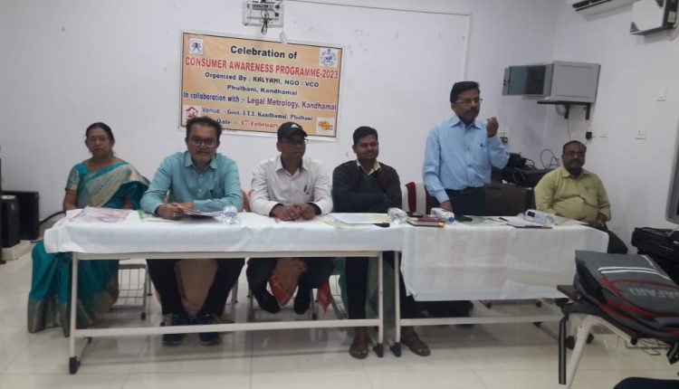 ଫୁଲବାଣୀ : କନ୍ଧମାଳ ଜିଲ୍ଲା ଫୁଲବାଣୀ ସ୍ଥିତ ସରକାରୀ ଶିଳ୍ପ ତାଲିମ ଅନୁଷ୍ଠାନ ପରିସରରେ ଖାଉଟି ସୁରକ୍ଷା ସଚେତନତା ସପ୍ତାହ ପାଳିତ ହୋଇଯାଇଛି । ସ୍ୱେଚ୍ଛାସେବୀ ଅନୁଷ୍ଠାନ କଲ୍ୟାଣୀ ତରଫରୁ ଏହି କାର୍ଯ୍ୟକ୍ରମ ଆୟୋଜିତ ହୋଇଥିଲା ବେଳେ ଅନୁଷ୍ଠାନର ଅଧ୍ୟକ୍ଷ ଇଂ. ପ୍ରକାଶ ଚନ୍ଦ୍ର ସେଠୀ ମୁଖ୍ୟ ଅତିଥି ଭାବେ ଯୋଗ ଦେଇଥିଲେ । ବରିଷ୍ଠ ଅଧିବକ୍ତା ଓ ସାହିତ୍ୟିକ ବିଜୟକୃଷ୍ଣ ପଟ୍ଟନାୟକ ଯୋଗଦେଇଥିଲେ । ସାମ୍ପ୍ରତିକ ସମୟରେ ଗ୍ରାହକମାନେ ସଚେତନ ହେବା ସହ ଜିନିଷ କିଣିଲା ବେଳେ ଯେମିତି ଠକାମିରେ ନ ପଡିବେ ଏବଂ ବିଲ ସାଙ୍ଗରେ ନେବେ ବୋଲି ମତ ଦେଇଥିଲେ । ଅନ୍ୟମାନଙ୍କ ମଧ୍ୟରେ ମାପ ଓ ଓଜନ ବିଭାଗର ଅଧିକାରୀ ରାଜେଶ କୁମାର ନାୟକ ଓ ବିକାଶ ଚନ୍ଦ୍ର ସାହୁ, ସାଧାରଣ ଯୋଗାଣ ଅଧିକାରୀ ଶ୍ରୀ ସତ୍ୟବ୍ରତ ଷେଣ୍ଢ ପ୍ରମୁଖ ଯୋଗ ଦେଇ ନିଜ ନିଜ ବକ୍ତବ୍ୟ ରଖିଥିଲେ । କଲ୍ୟାଣୀର ସମ୍ପାଦିକା ବିଜୟଲକ୍ଷ୍ମୀ ସାହୁ ପରିଚାଳନା କରିଥିଲା ବେଳେ ତାଲିମପ୍ରାପ୍ତ ଅଧିକାରୀ ଡ଼ଃ ନୃସିଂହାନନ୍ଦ ମହାପାତ୍ର ଧନ୍ୟବାଦ ଅର୍ପଣ କରିଥିଲେ । ଅନୁଷ୍ଠାନର ସମସ୍ତ ଛାତ୍ରଛାତ୍ରୀ ଉପସ୍ଥିତ ଥିଲାବେଳେ ଅନ୍ୟ କର୍ମଚାରୀ ମାନେ ସହଯୋଗ କରିଥିଲେ ।