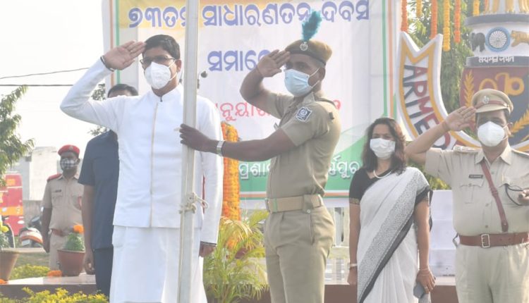 ସୁବର୍ଣ୍ଣପୁର: ସୁବର୍ଣ୍ଣପୁର ସଦର ମହକୁମାରେ ଜିଲ୍ଲା ସ୍ତରୀୟ ୭୩ତମ ସାଧାରଣତନ୍ତ୍ର ଦିବସ ସମାରୋହ କୋଭିଡ କଟକଣା ମଧ୍ୟରେ ପାଳିତ ହୋଇଯାଇଛି । ସ୍ଥାନୀୟ ରିଜର୍ଭ ପୋଲିସ ପଡିଆ ଠାରେ ଅନୁଷ୍ଠିତ ଏହି ସମାରୋହରେ ଡ଼. ଅରୁଣକୁମାର ସାହୁ, ମନ୍ତ୍ରୀ କୃଷି ଓ କୃଷକ ସଶକ୍ତିକରଣ, ମତ୍ସ୍ୟ ଓ ପଶୁସମ୍ପଦ ବିକାଶ ଓ ଉଚ୍ଚ ଶିକ୍ଷା ବିଭଗ, ଓଡିଶା ମୁଖ୍ୟଅତିଥି ଭାବେ ଯୋଗଦାନ କରିବା ସହ ଦେଶର ଗର୍ବ ଓ ଗୌରବର ପ୍ରତୀକ ଜାତୀୟ ପତାକାକୁ ଉତ୍ତୋଳନ କରି ଅଭିବାଦନ ଗ୍ରହଣ ପୂର୍ବକ ଜିଲ୍ଲାବାସୀଙ୍କ ଉଦ୍ଦେଶ୍ୟରେ ଉଦବୋଧନ ଦେଇଥିଲେ । ମନ୍ତ୍ରୀ ଡ଼.ସାହୁ କହିଲେ ଯେ, ଭାରତର ସମ୍ବିଧାନ ବିଶ୍ୱରେ ଅଦ୍ୱିତୀୟ, ଅନେକତା ମଧ୍ୟରେ ଏକତା ଏହାର ବୈଶିଷ୍ଟ୍ୟ । ଦେଶର ଗର୍ବ ଗୌରବ ଓ ଗାରିମାକୁ ବଜାୟ ରଖିବା ଆମ ସମସ୍ତଙ୍କ ଦାୟିତ୍ୱ ଓ ତାର ଅନୁପାଳନ ଆମର କର୍ତ୍ତବ୍ୟ । ସେ ସୁବର୍ଣ୍ଣପୁର ଜିଲ୍ଲାର ସ୍ୱାଧୀନତା ସଂଗ୍ରାମୀଙ୍କ ତ୍ୟାଗ ଓ ବଳିଦାନର ସ୍ମୃତିଚାରଣ କରି ସେମାନଙ୍କୁ ଗଭୀର ଶ୍ରଦ୍ଧାଞ୍ଜଳି ଅର୍ପଣ କରିଥିଲେ । ଜିଲ୍ଲାର ସାହିତ୍ୟ, କଳା, ସଂସ୍କୃତି, ପରମ୍ପରା ଓ ଜିଲ୍ଳା ଇତିହାସର ଅବଲୋକନ ପୂର୍ବକ ଏକ ସ୍ୱାଧୀନ ବିକାଶ ମୂଳକ ରାଷ୍ଟ୍ର ଗଠନରେ ଜିଲ୍ଲାର ଅବଦାନକୁ ପ୍ରଶଂସା କରିଥିଲେ ।